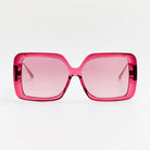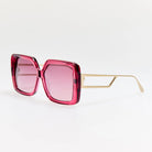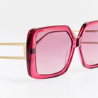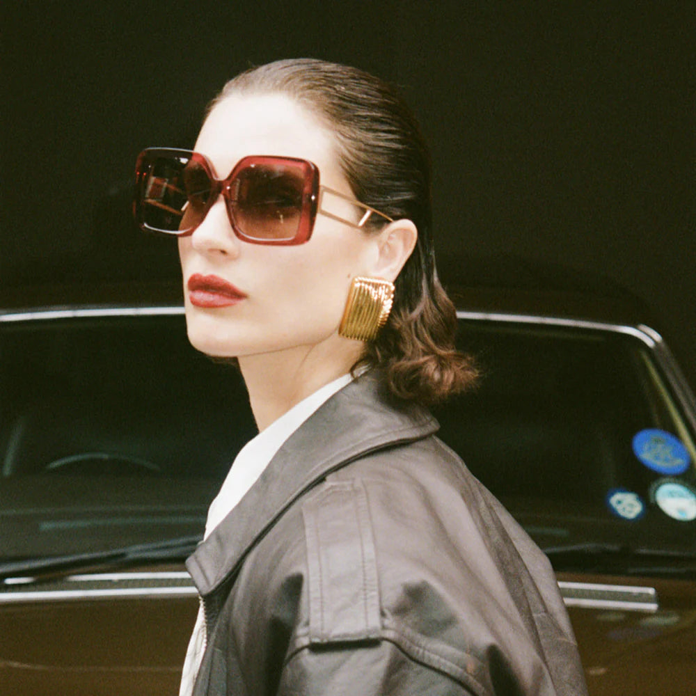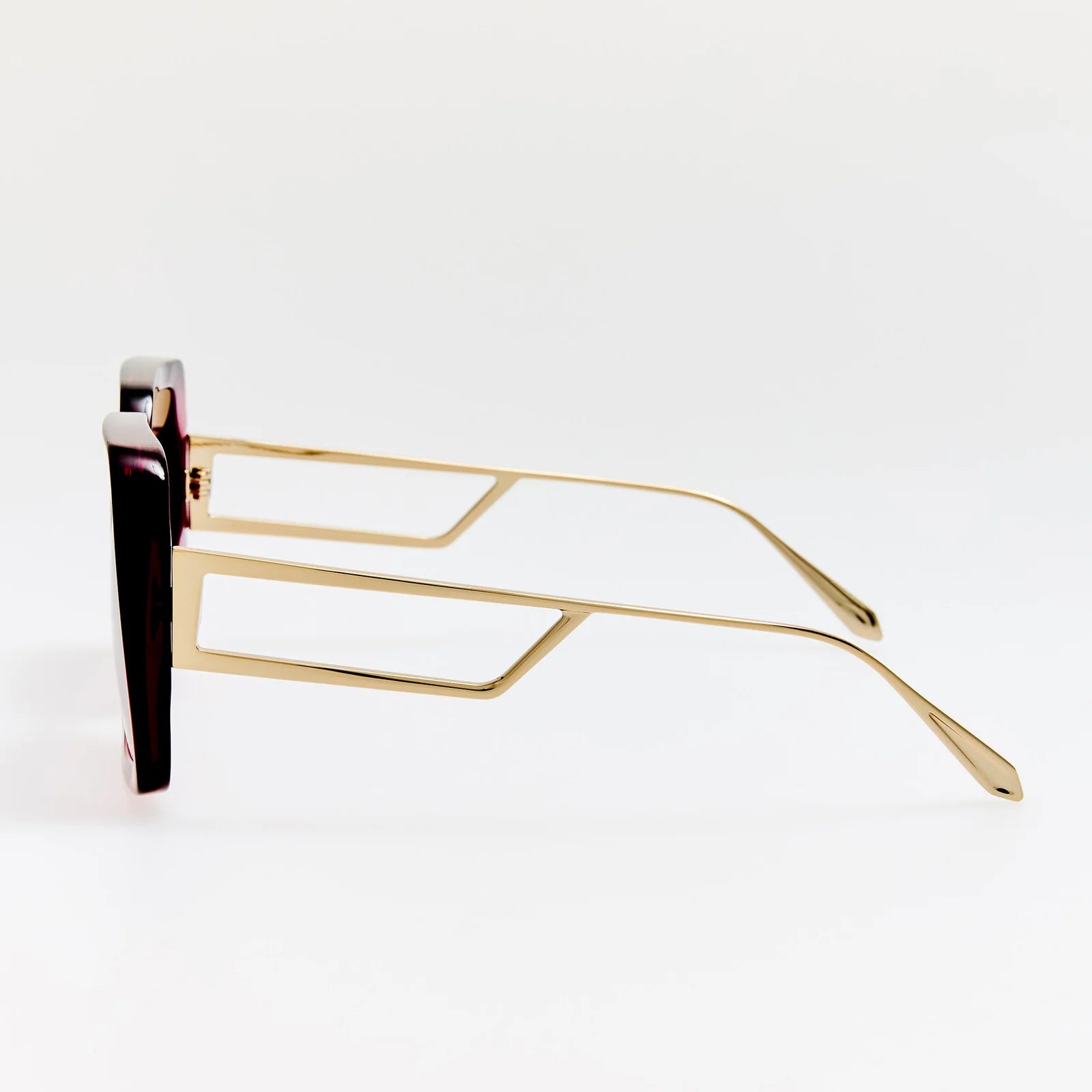 Introducing the Macy oversized frame is crafted from Italian wine acetate rims and contrasting 22k gold plated Japanese titanium temples featuring a geometric cut-out design ,giving them a sculptural, high-fashion appearance. Fitted with mauve gradient lenses offering full UV protection and sculpted nose pads for a tailored fit.