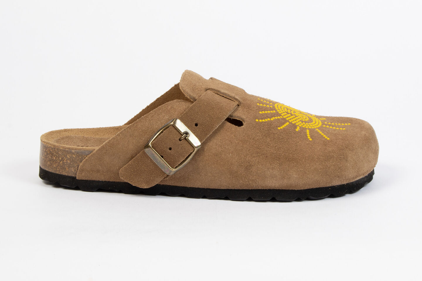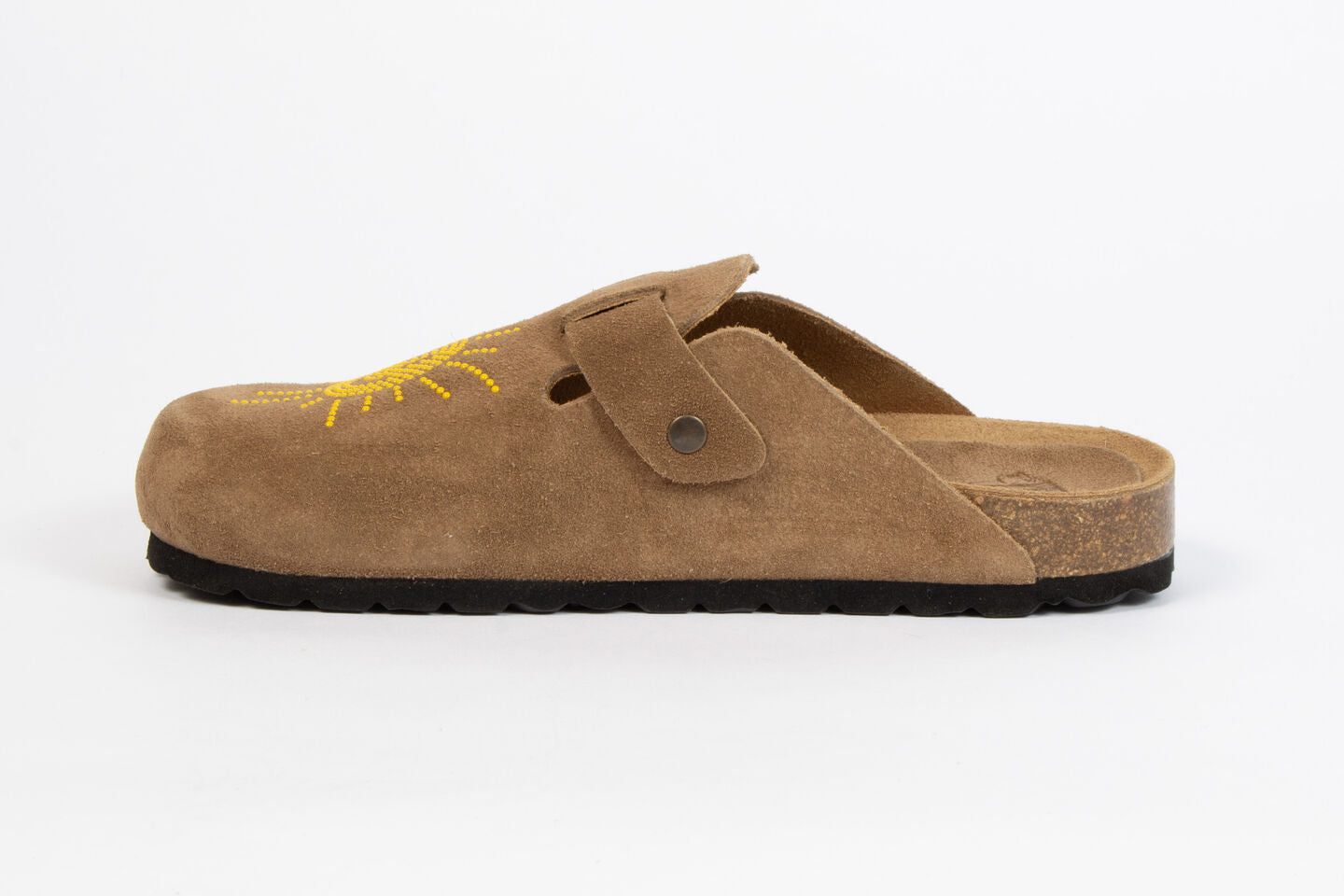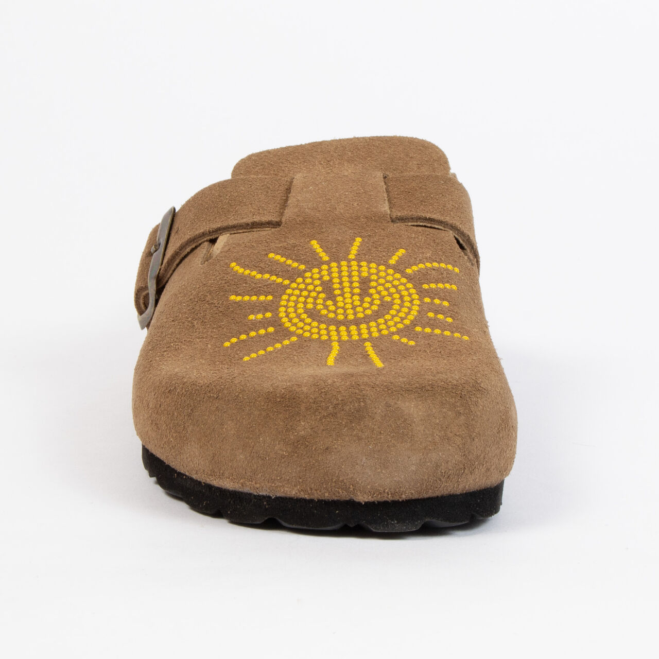 Brighten your day with the Sabot Smiley Shoes, where cheerful design meets classic comfort. These sabots are crafted from soft suede in a warm, earthy tone, and feature a unique smiley sun design embroidered in yellow beads, adding a playful touch to your everyday wear. The adjustable straps ensure a perfect fit, making these shoes as practical as they are fun. Ideal for anyone who wants to add a bit of joy to their step, these sabots combine artisanal quality with whimsical charm, making them a delightful addition to your wardrobe.