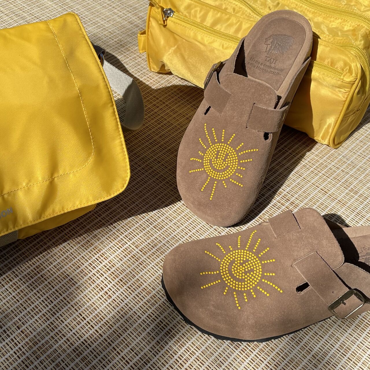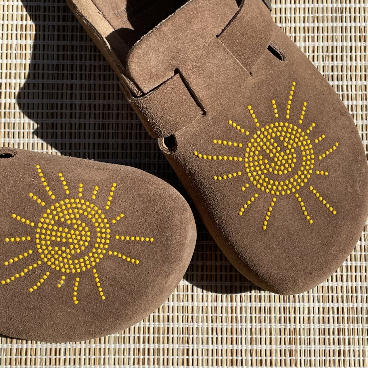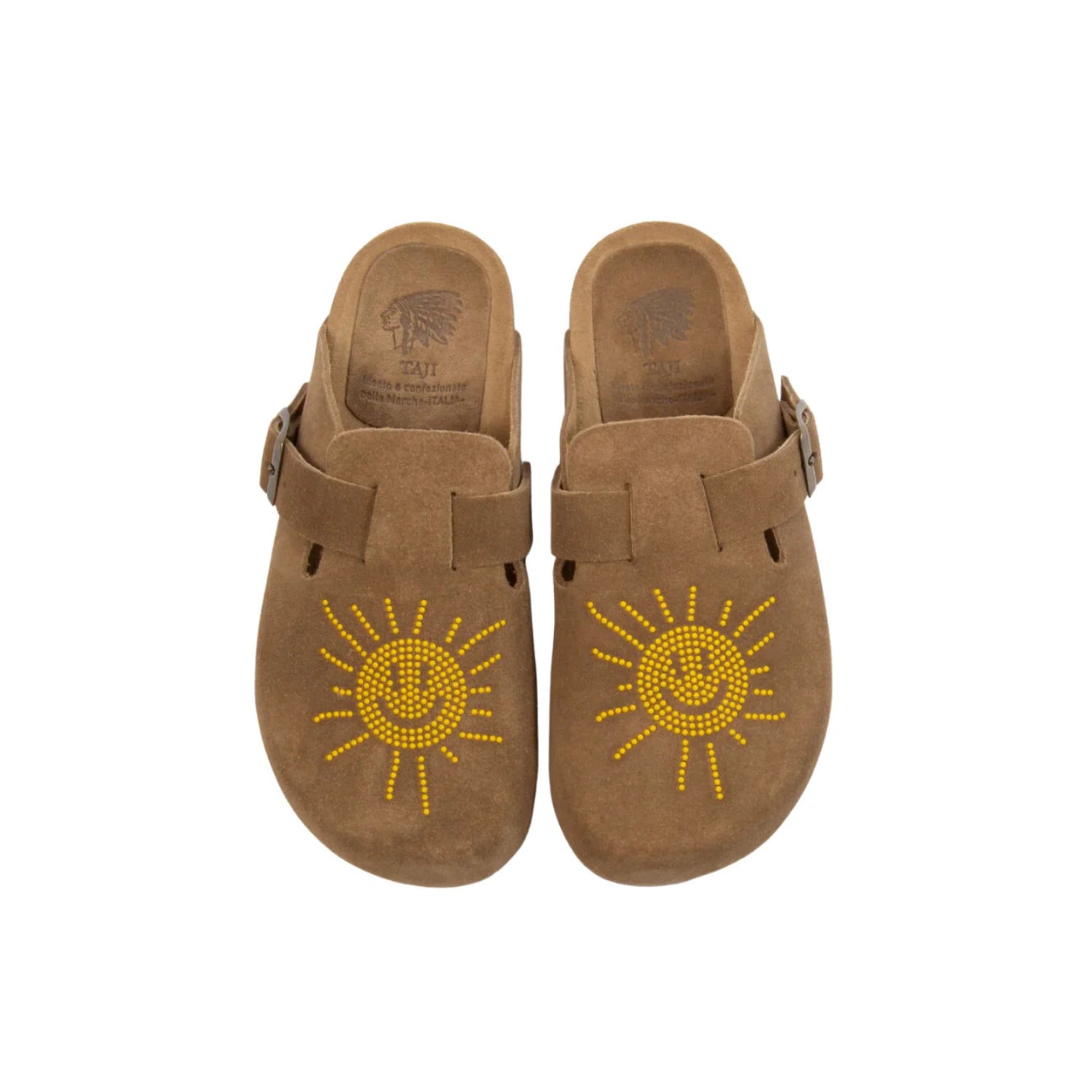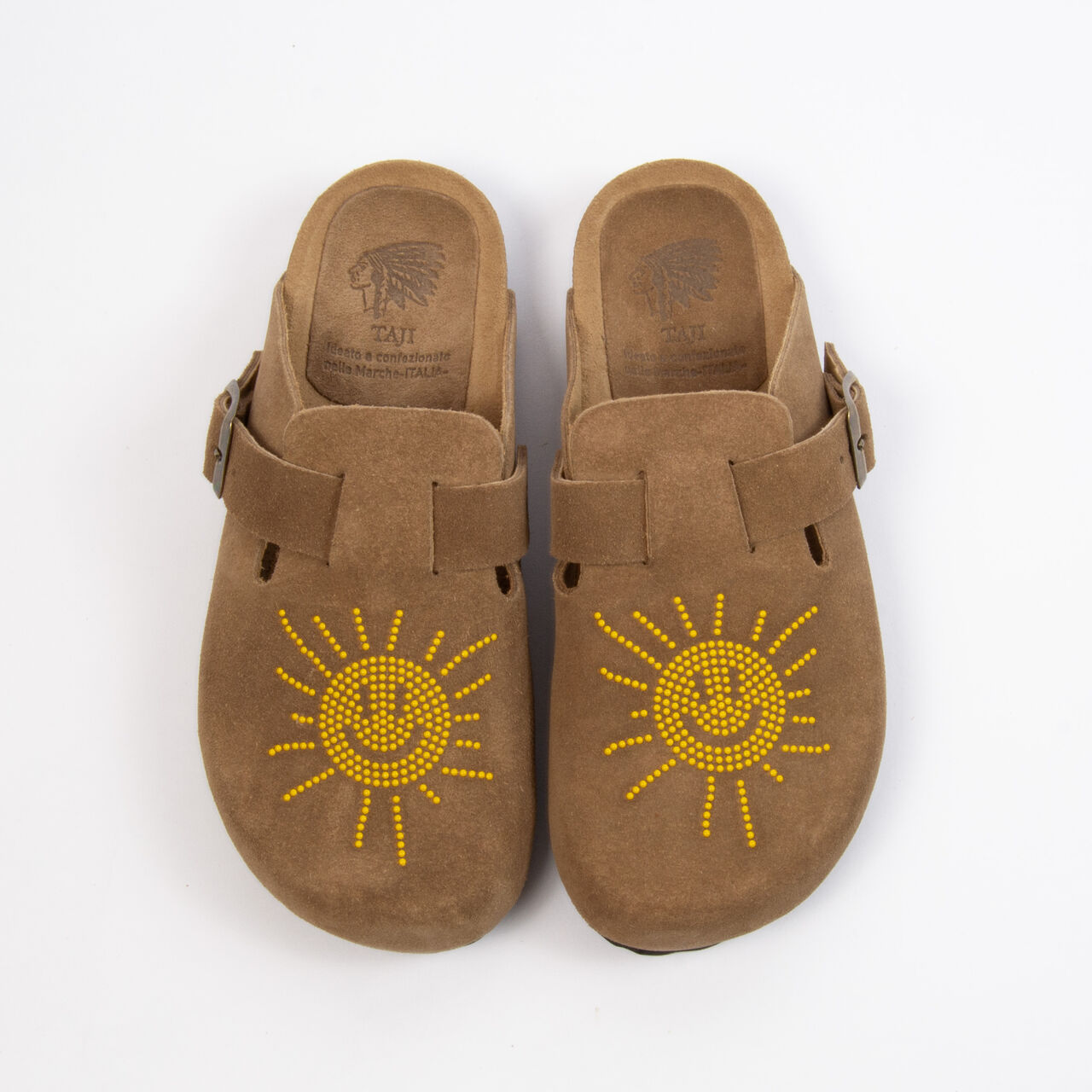 Brighten your day with the Sabot Smiley Shoes, where cheerful design meets classic comfort. These sabots are crafted from soft suede in a warm, earthy tone, and feature a unique smiley sun design embroidered in yellow beads, adding a playful touch to your everyday wear. The adjustable straps ensure a perfect fit, making these shoes as practical as they are fun. Ideal for anyone who wants to add a bit of joy to their step, these sabots combine artisanal quality with whimsical charm, making them a delightful addition to your wardrobe.