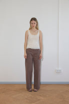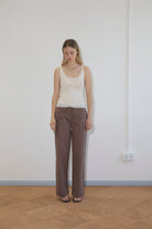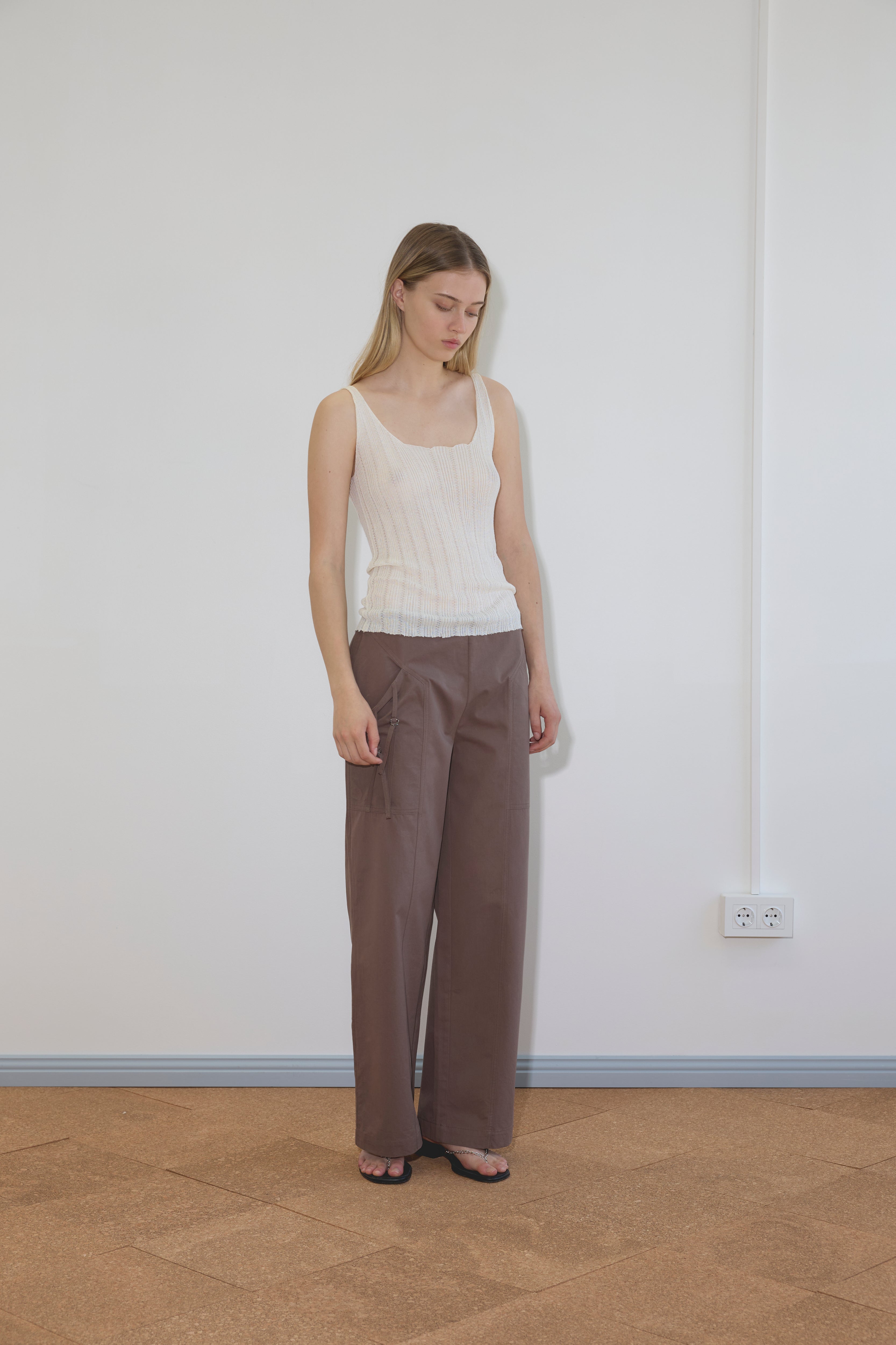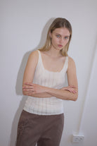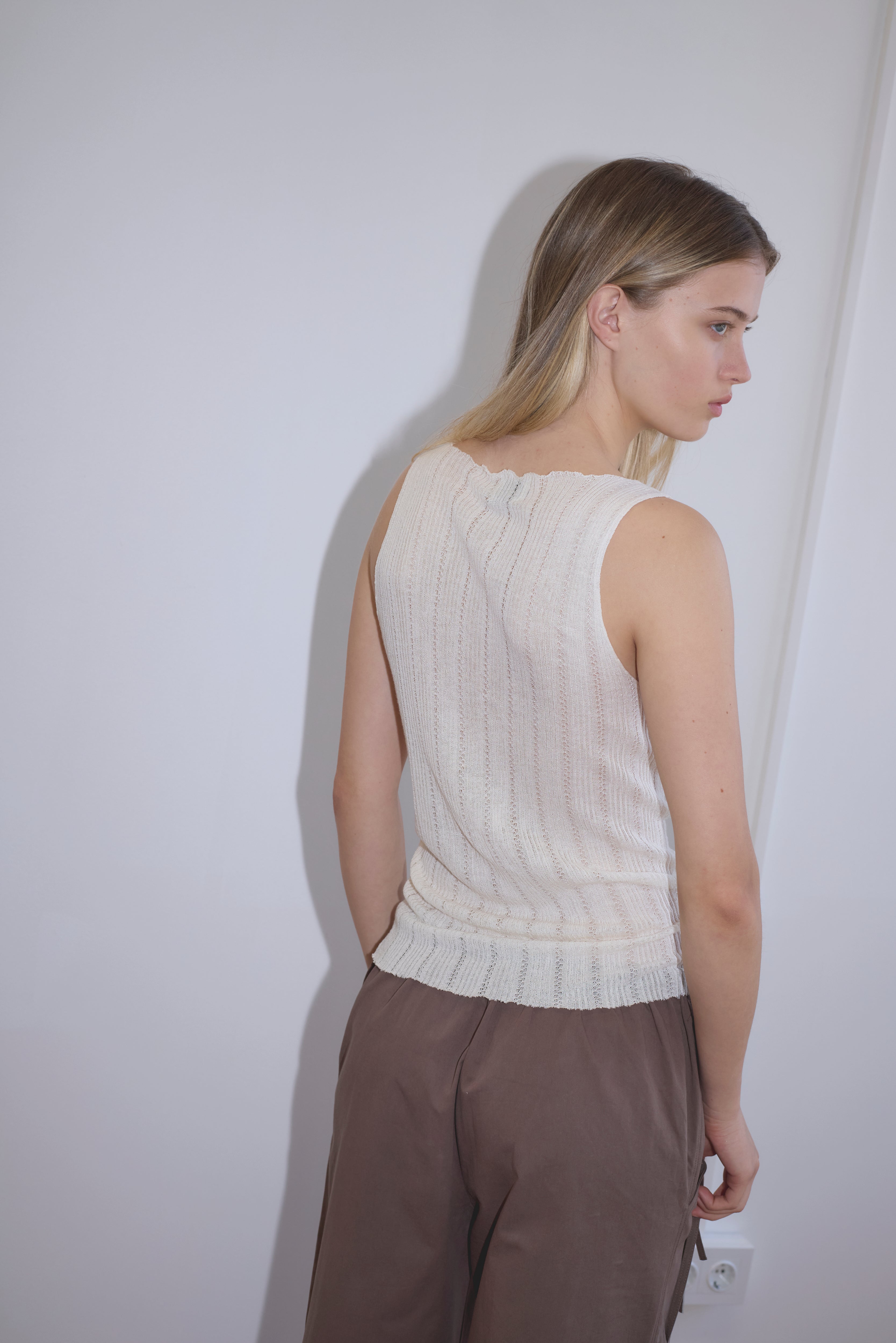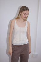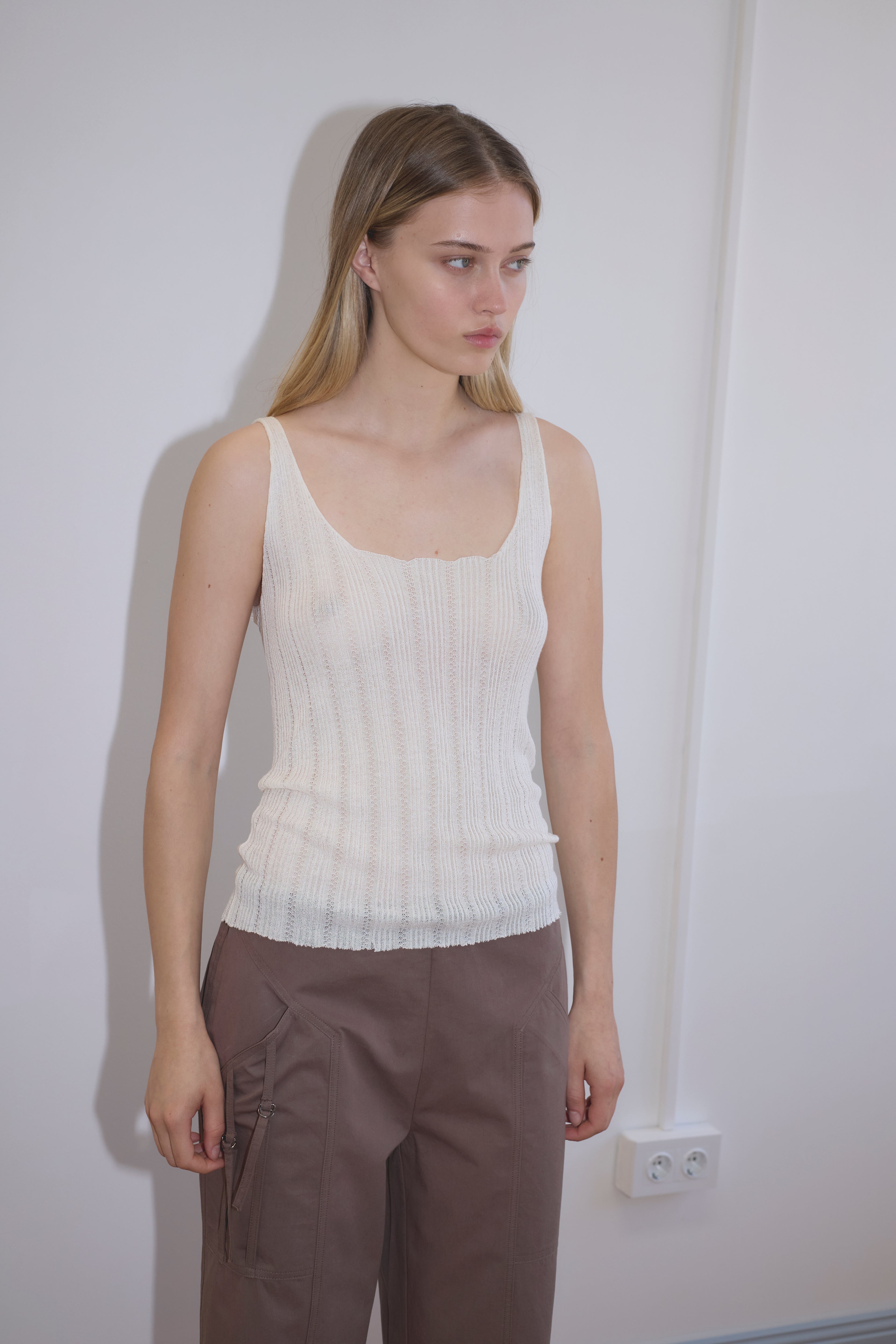a sheer ribbed fine knit tank with a low curved neckline featuring a babylock hem