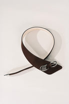 A dramatic modification of Déhanche's signature Hollyhock belt. The Alcott holds a bold-asymmetrical silhouette and polishes with the classic 5-ring hardware accent.