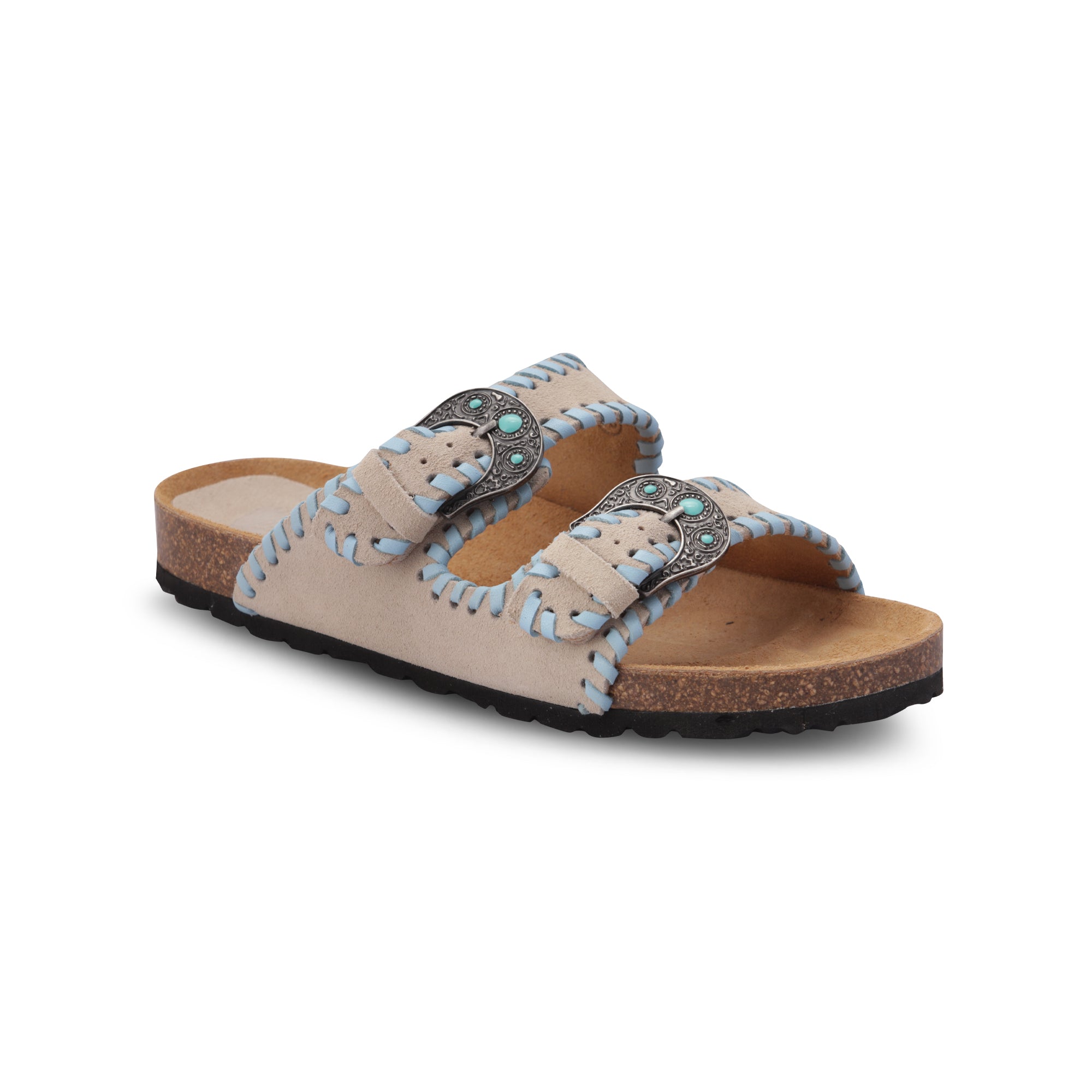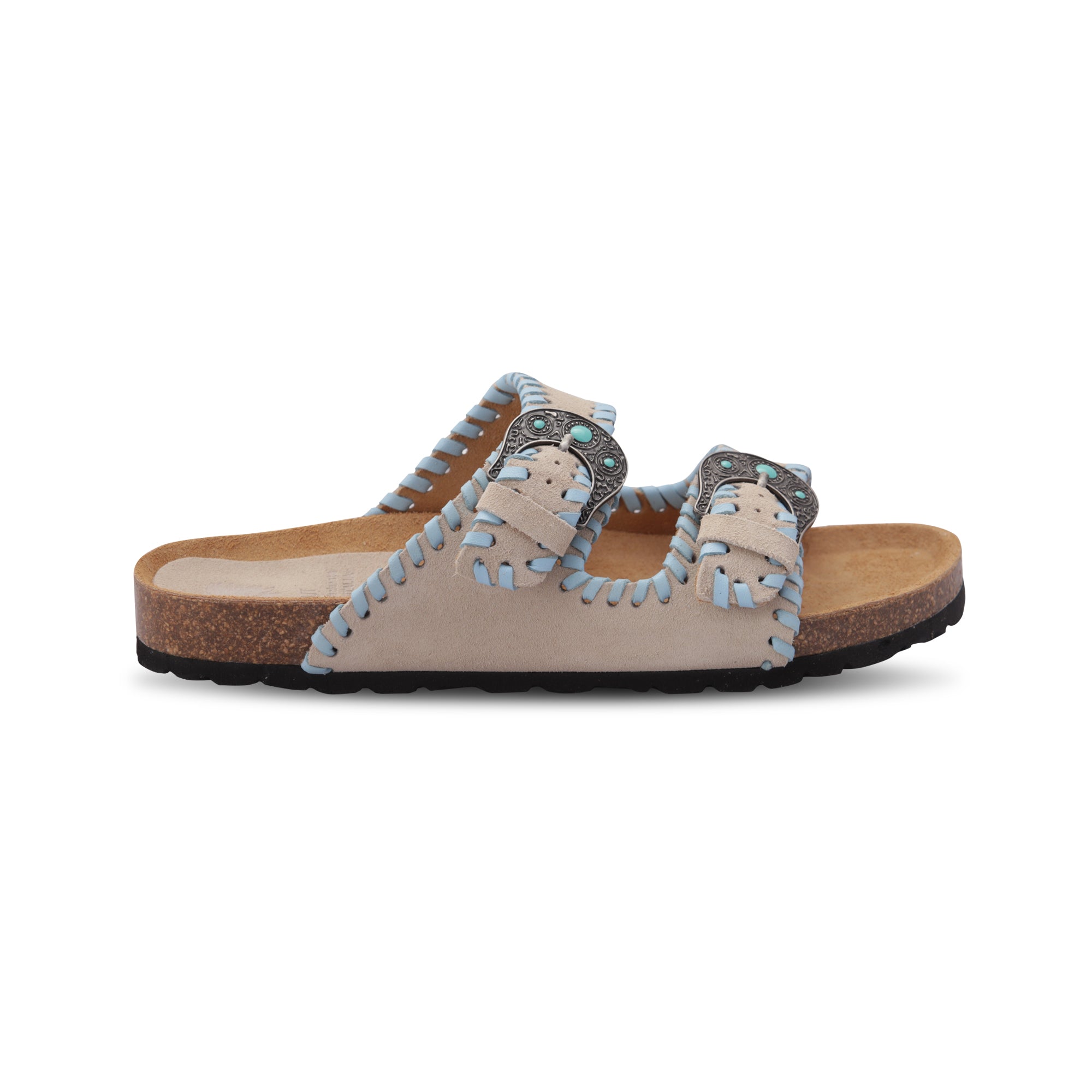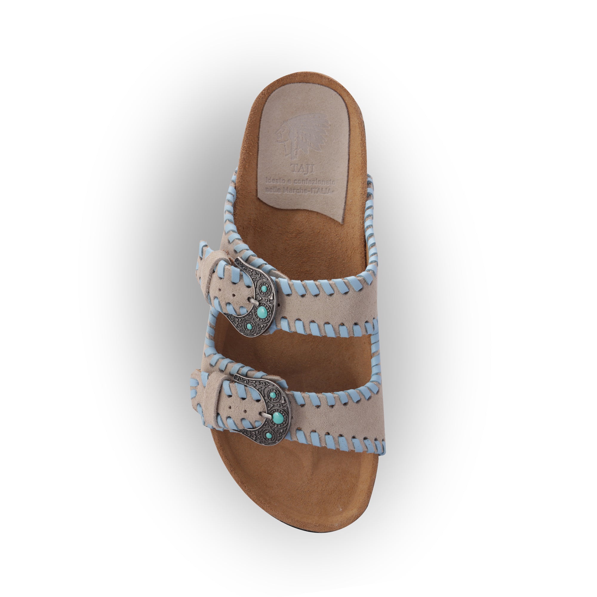 2-strap sandal with turquoise stone buckles, raw-colored suede upper with sky nappa inserts and anatomical sole lined in calfskin. Perfect for those who appreciate footwear that combines traditional craftsmanship with stylish detailing, these sabots are a testament to Italian artisanal skills and a chic addition to any wardrobe.