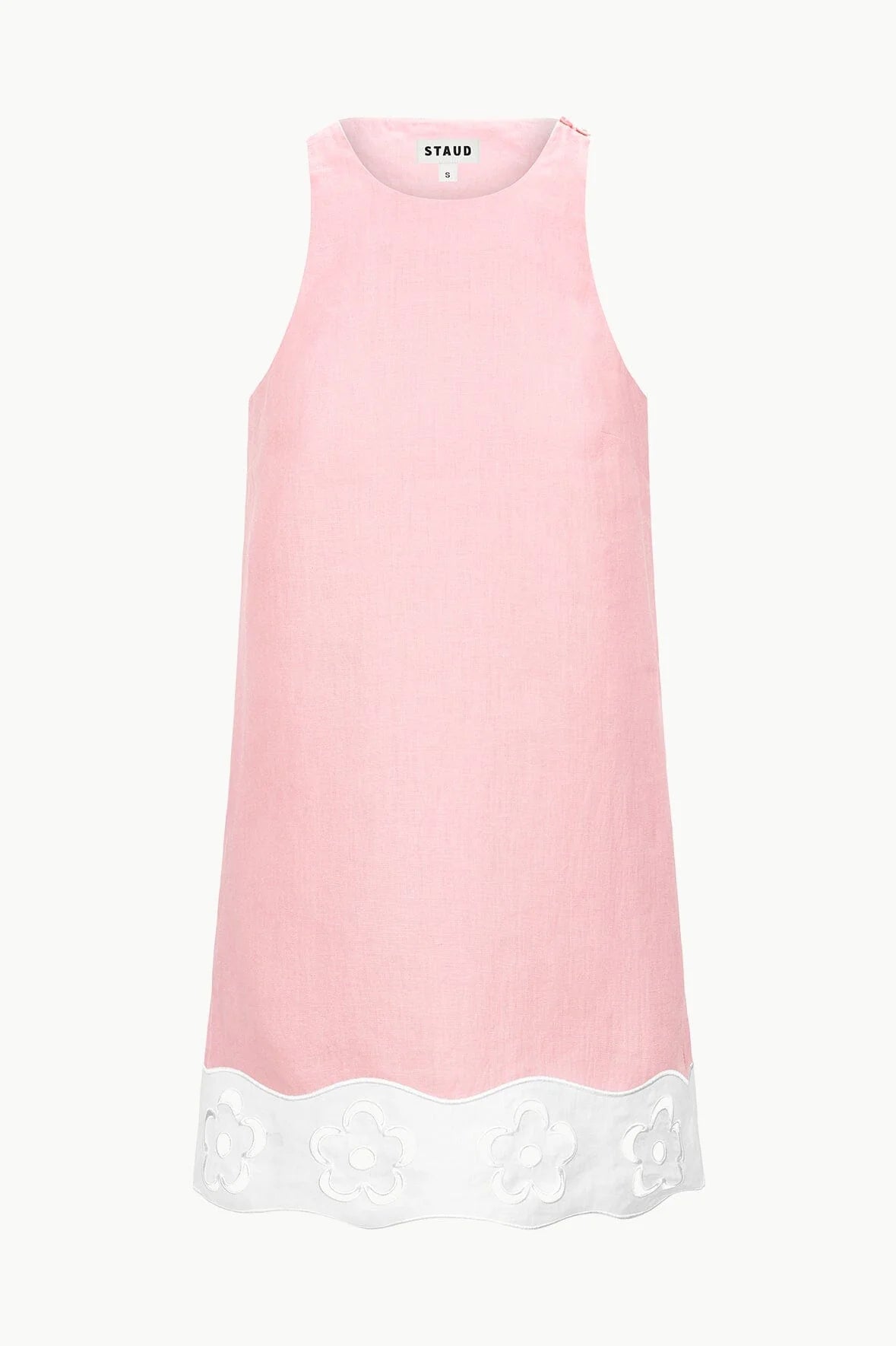 The Mika Linen Dress is a crewneck sleeveless mini a-line dress with a contrast floral cutout at the hem. This style is offered in a lightweight linen and features side pockets.