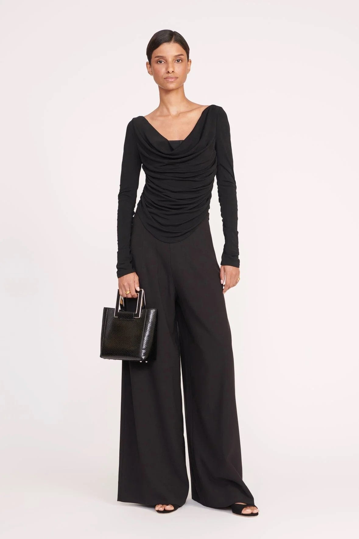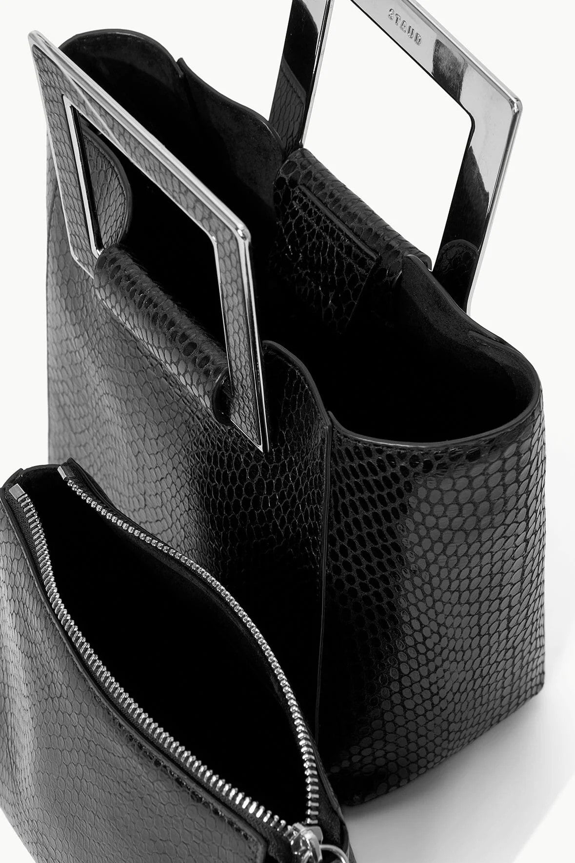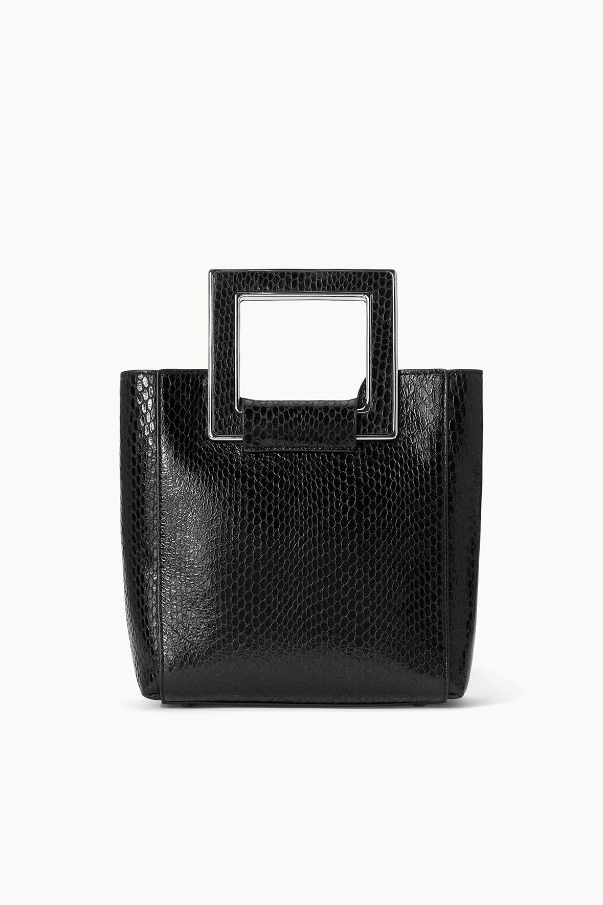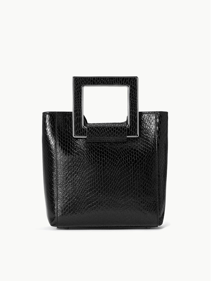 The Mini Shirley has been updated for the season with chic square metal handles and a snake embossed leather body. This style comes with a detachable crossbody strap and removable matching pouch.