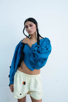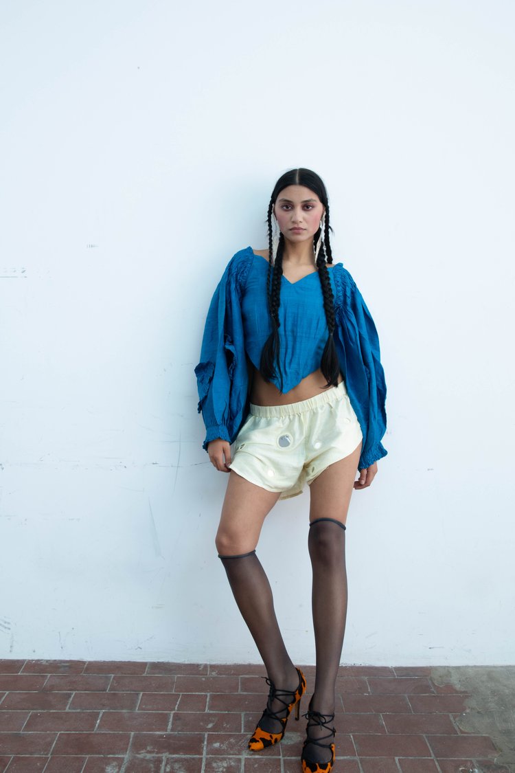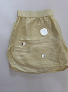Hand-woven raw silk sprinter shorts with large mirror work. Elastic waist.