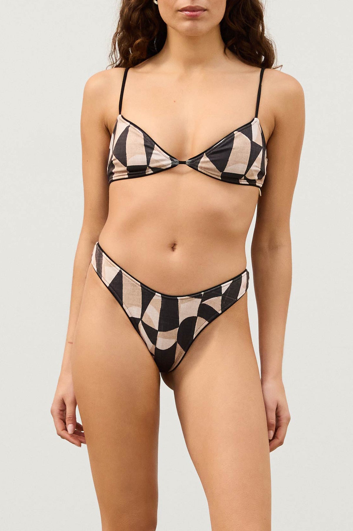 The Mosaic Curve Thong Brief bikini designed with a smooth, mid-weight fabric, this brief features a custom hand-painted mosaic print for a bold, artistic touch with black contrast piping. Sitting high on the hips for a flattering fit, it offers minimal coverage. Pair with the Mosaic Bralette for a coordinated look.