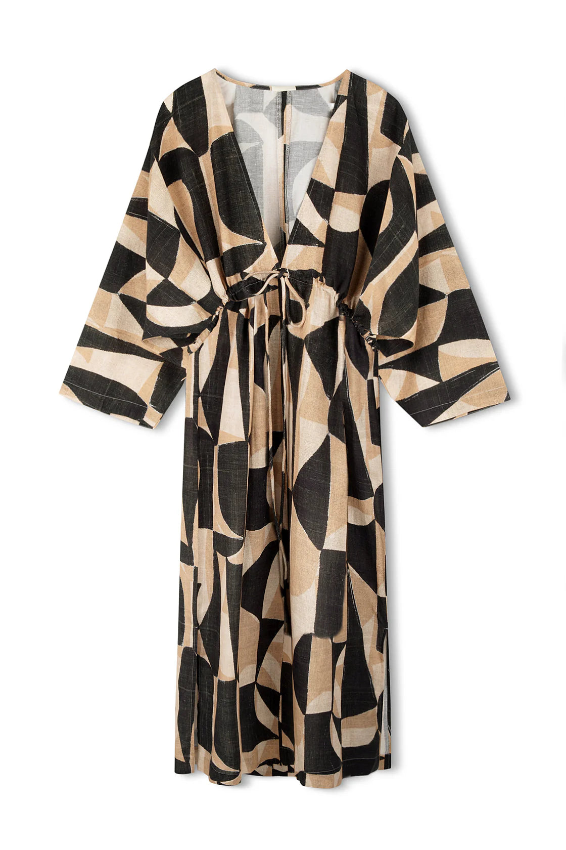 The Mosaic Linen Blend Dress showcases a custom hand-painted mosaic print in a modern monochrome palette. Designed with a long-sleeve silhouette, a plunging neckline, and adjustable drawcord detailing at the waist, this dress offers both comfort and style. Its flattering cut complements every shape, making it a truly unique addition to your fall wardrobe.