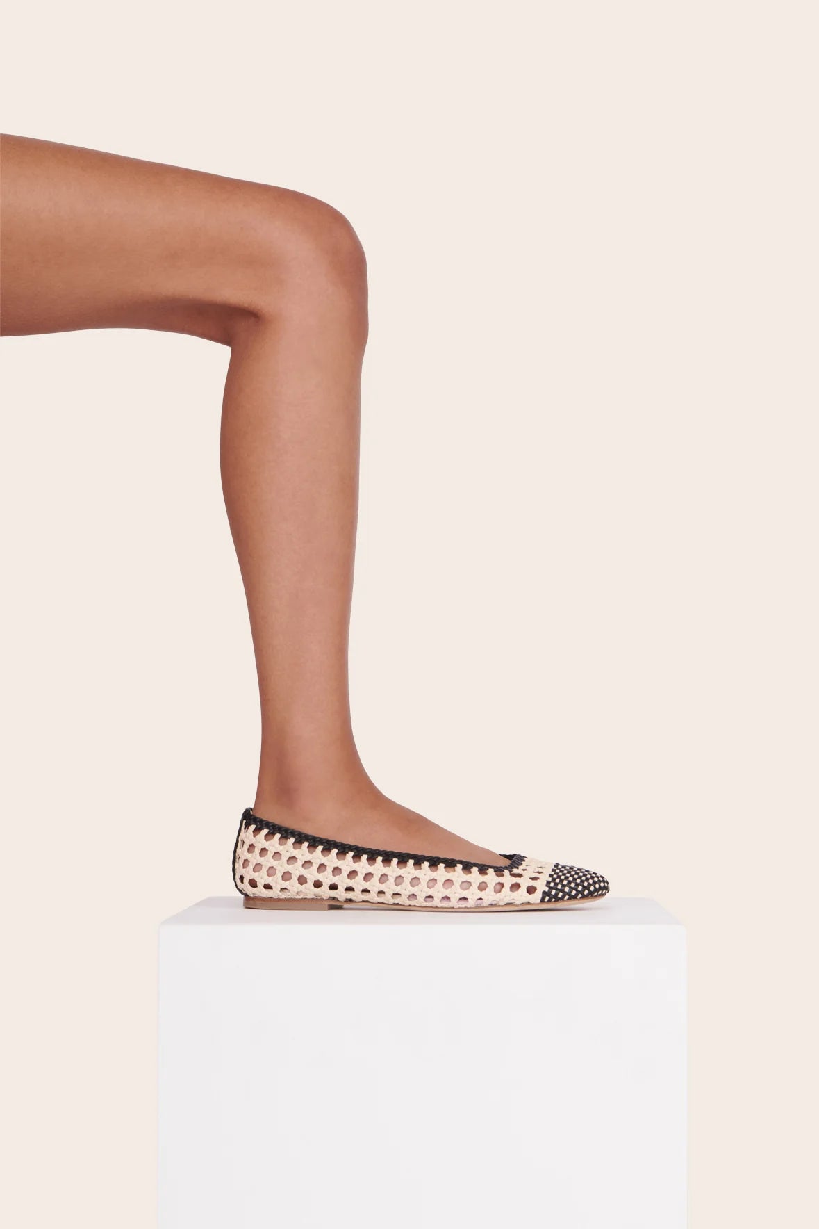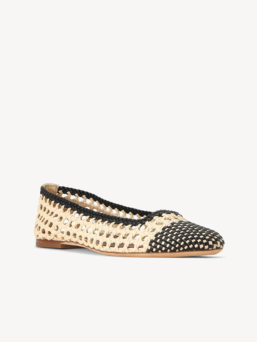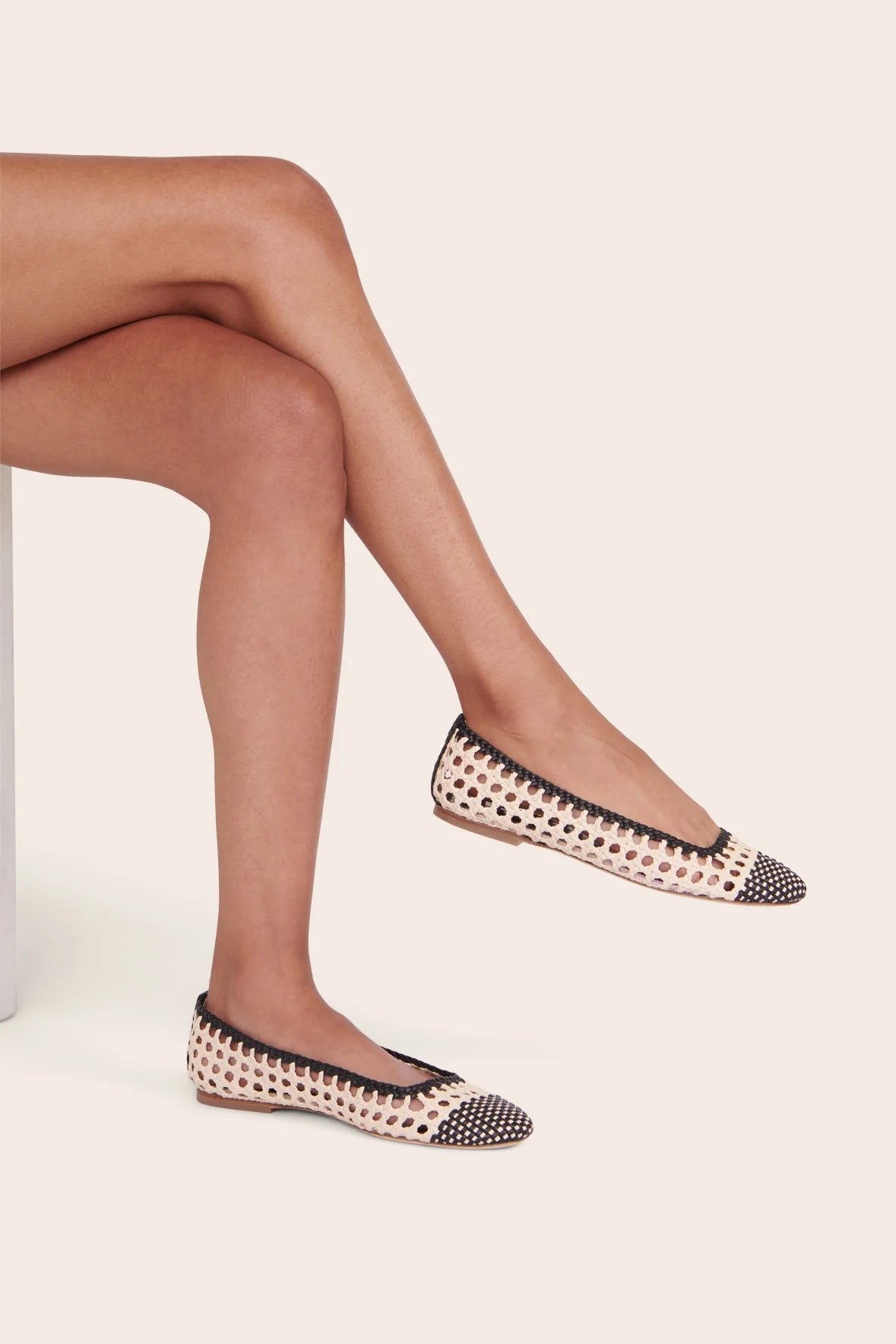 The Nell Crochet Ballerina is a handwoven ballerina flat with a round cap toe in black and cream leather.