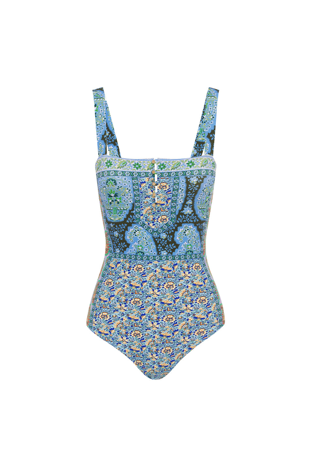 Square-neck one piece with soft wide straps and engineered BOTEH print