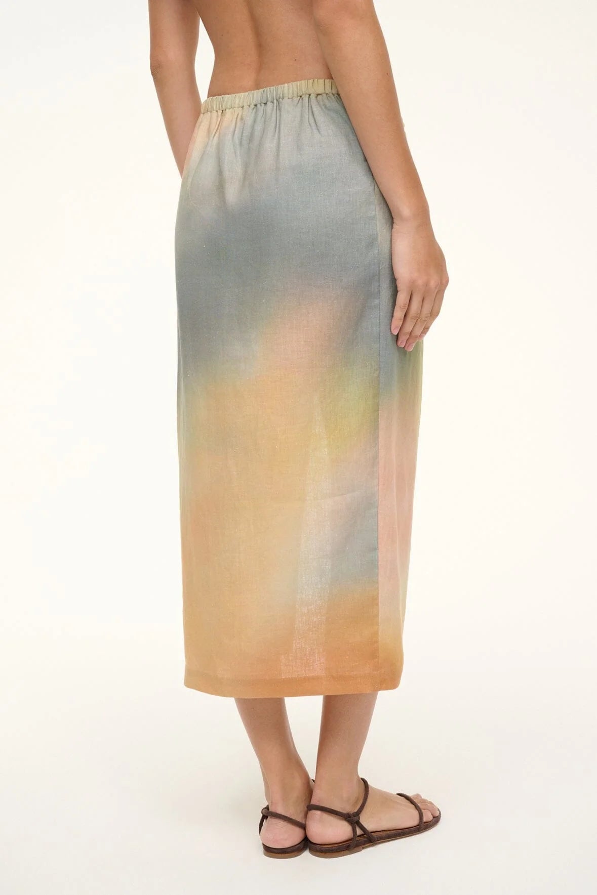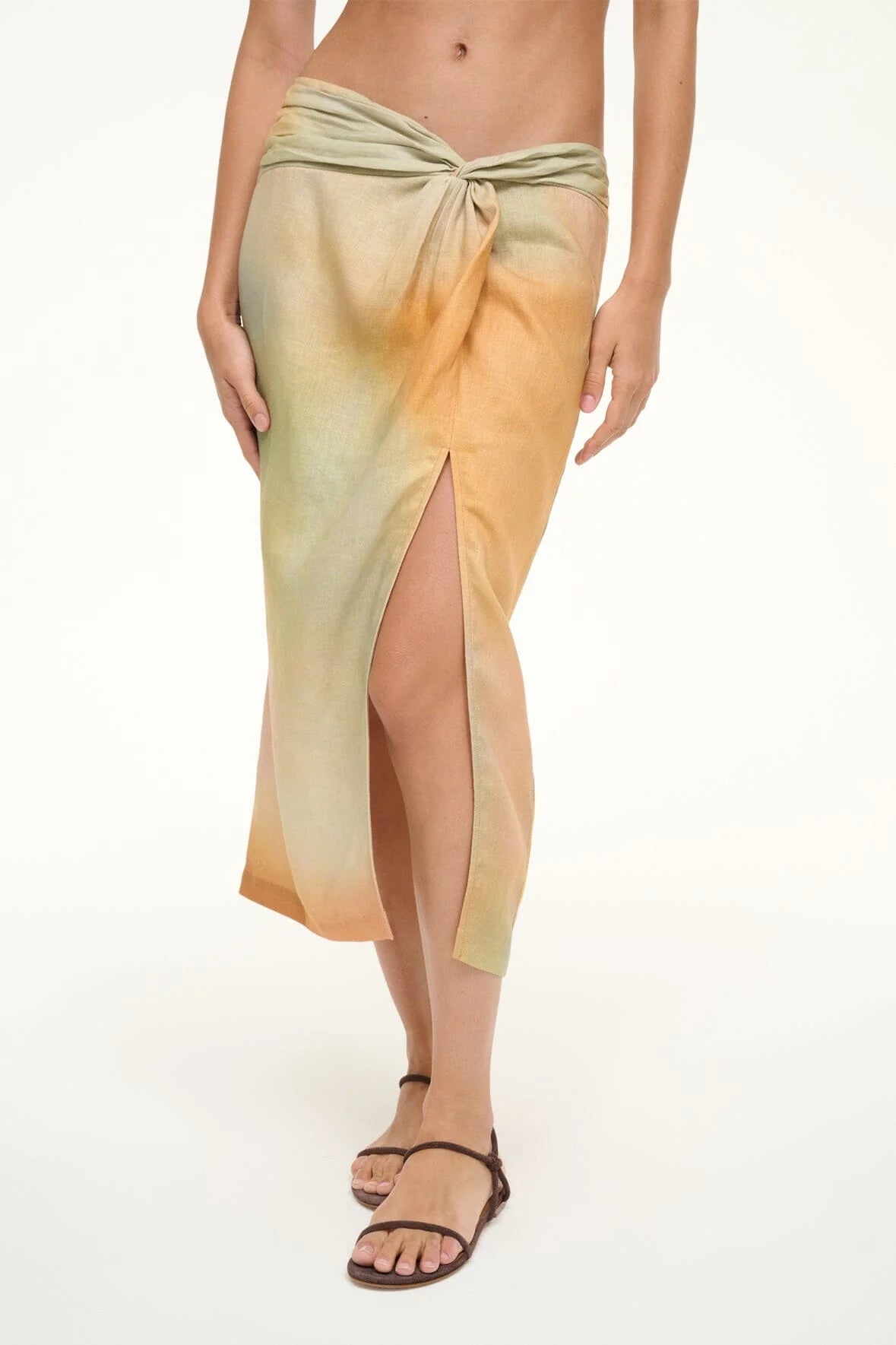A linen sarong-style skirt, the Porto features a front twist drape detail with a slit, but features an elastic waistband for ease of wear.