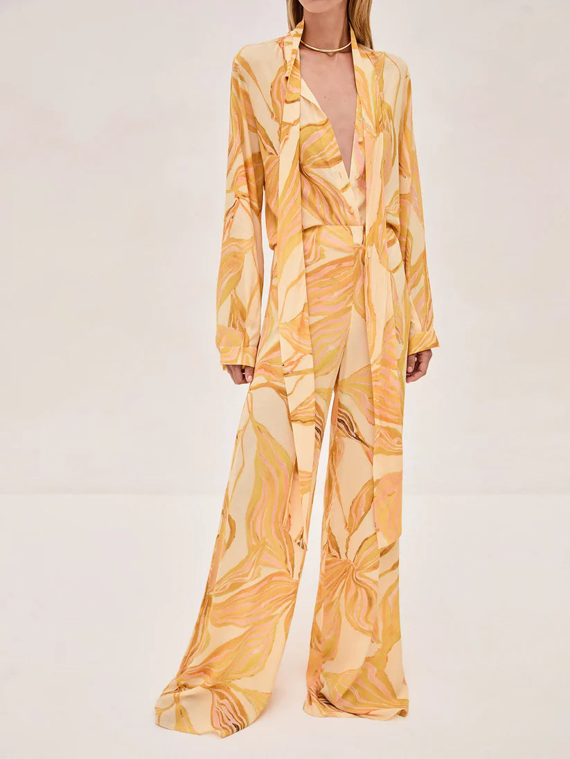 The Rizal Top is a chic and versatile piece with elegant neck ties that can be styled multiple ways. Featuring a breezy silhouette and an amber lily print, it pairs perfectly with the Cypher Pants for a coordinated look.