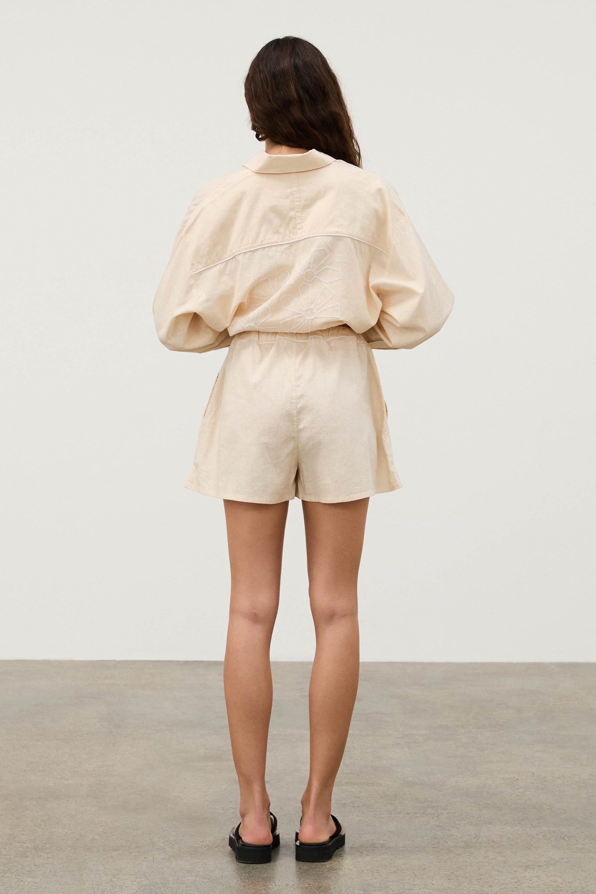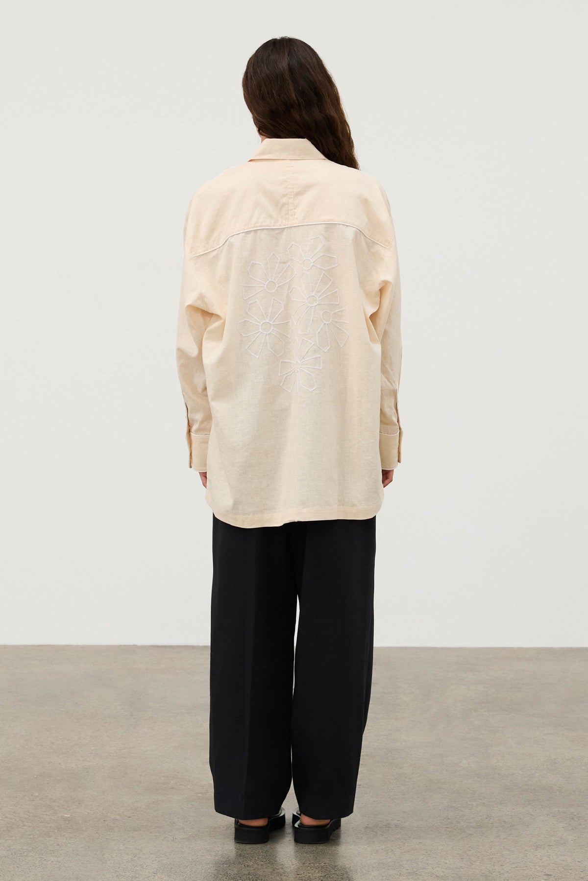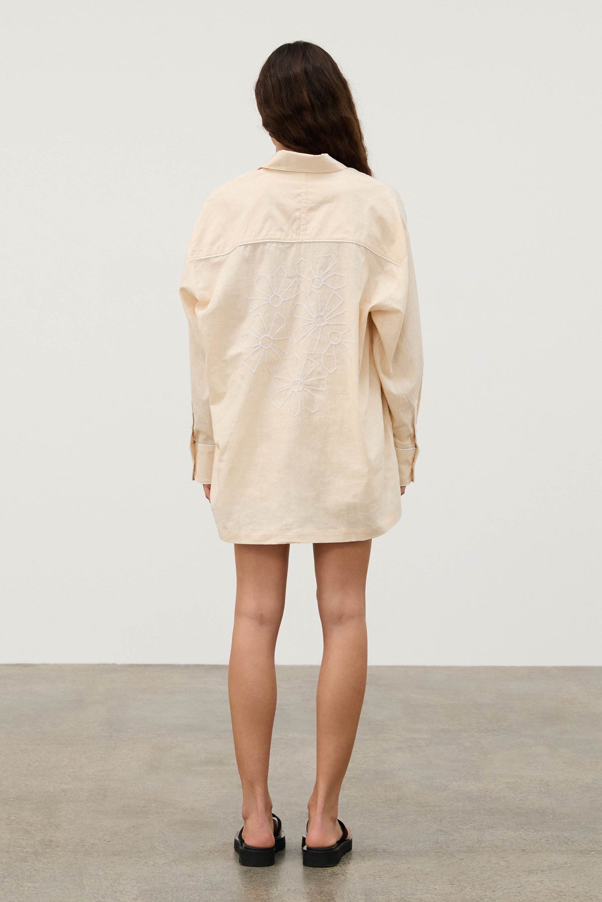 The Shea Embroidered Hemp Blend Shirt features a classic shirt collar and a centre front button closure. Its long sleeves are finished with cuffs and plackets for a polished look. The shirt showcases intricate geometric flower embroidery on the back, complemented by contrasting white piping details. Pair with Shea Hemp Blend Shorts for a coordinated look.