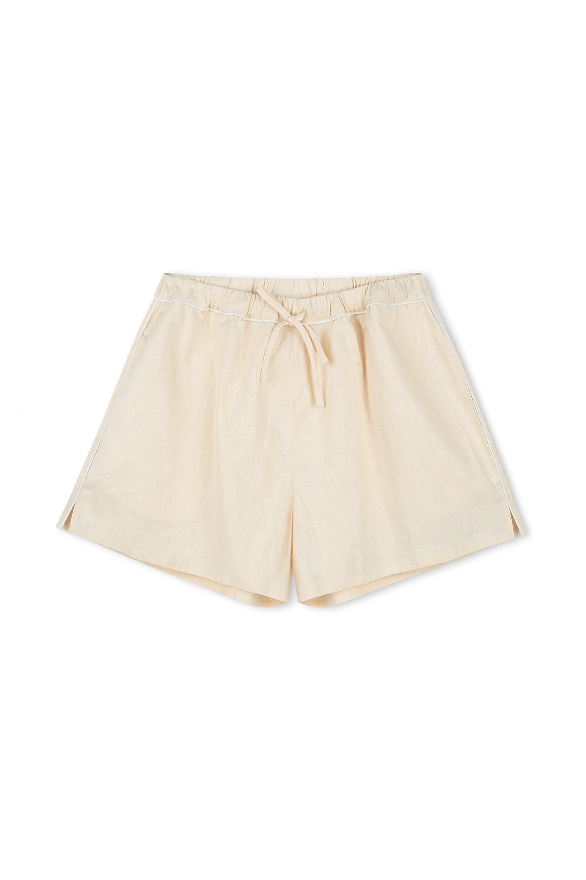 The Shea Hemp Blend Shorts are designed in a soft, creamy hue with an elastic waistband, a functional drawcord, and white piping detail. The short feature side seam pockets and a stylish split hem for a relaxed yet refined look. Wear with the Shea Embroidered Hemp Blend Shirt for a coordinated look.