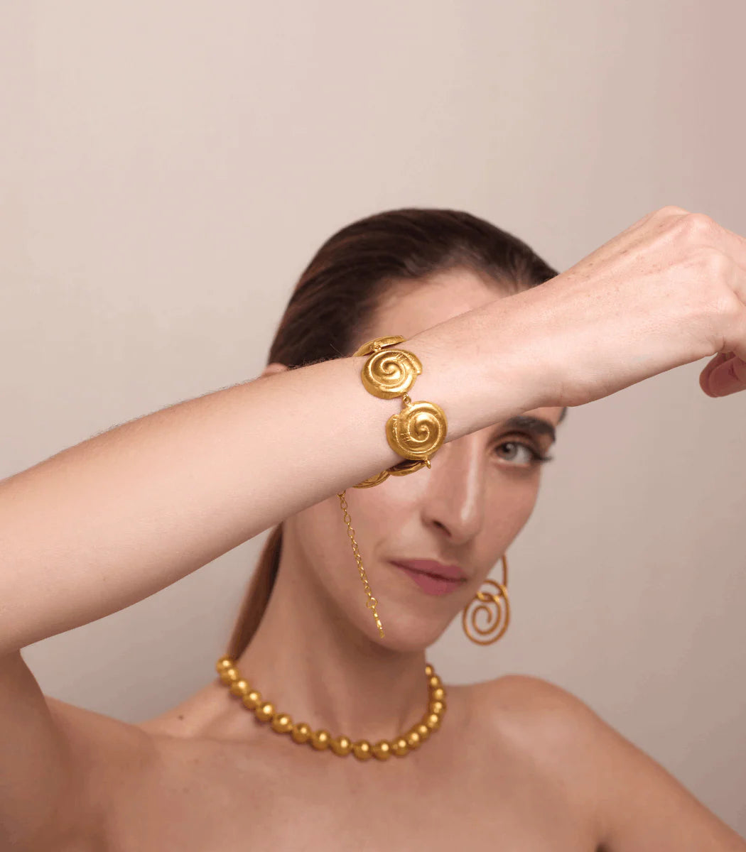 This elegant bracelet, inspired by the TAIRONA culture, features a distinctive design with spirals that evoke movement and continuous energy. The combination of shapes and materials creates a piece that stands out for its symbolism and beauty.