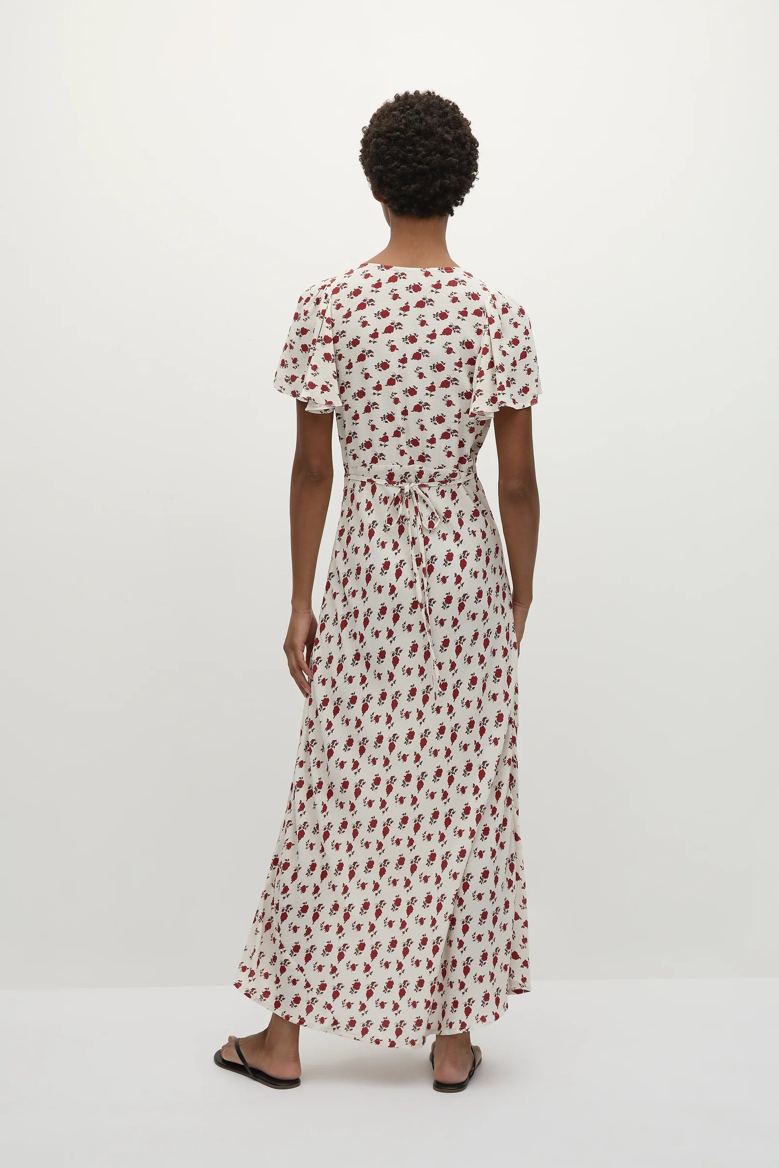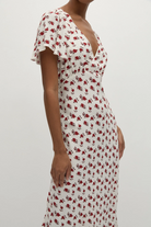 A feminine midi dress with a deep V-neckline and shrot flutter sleeves. With sublte gathering under the bust and a crossover detail for a more flattering finish, it falls softly in line with the body before falling into an A-line skirt that crops around the ankles. There are also back waist ties for custom cinching. Designed from a soft rayon fabrication in a vintage-inspired floral motif with deep red tones, style with a simple ballet flat for romantic day to night dressing.