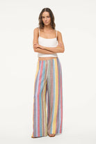A wide leg pull-on pant crafted in linen for all your Summer needs. The Bonfire features an elasticated waistband and vibrant striped pattern.