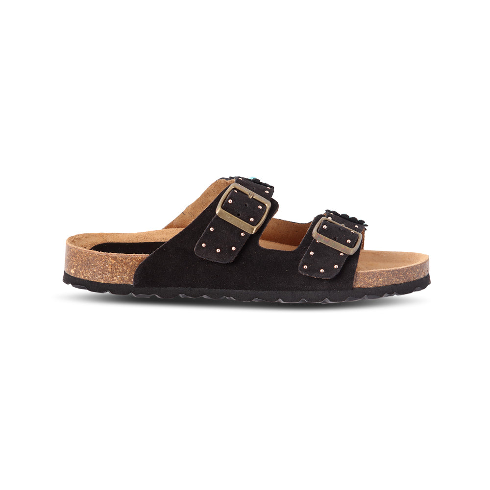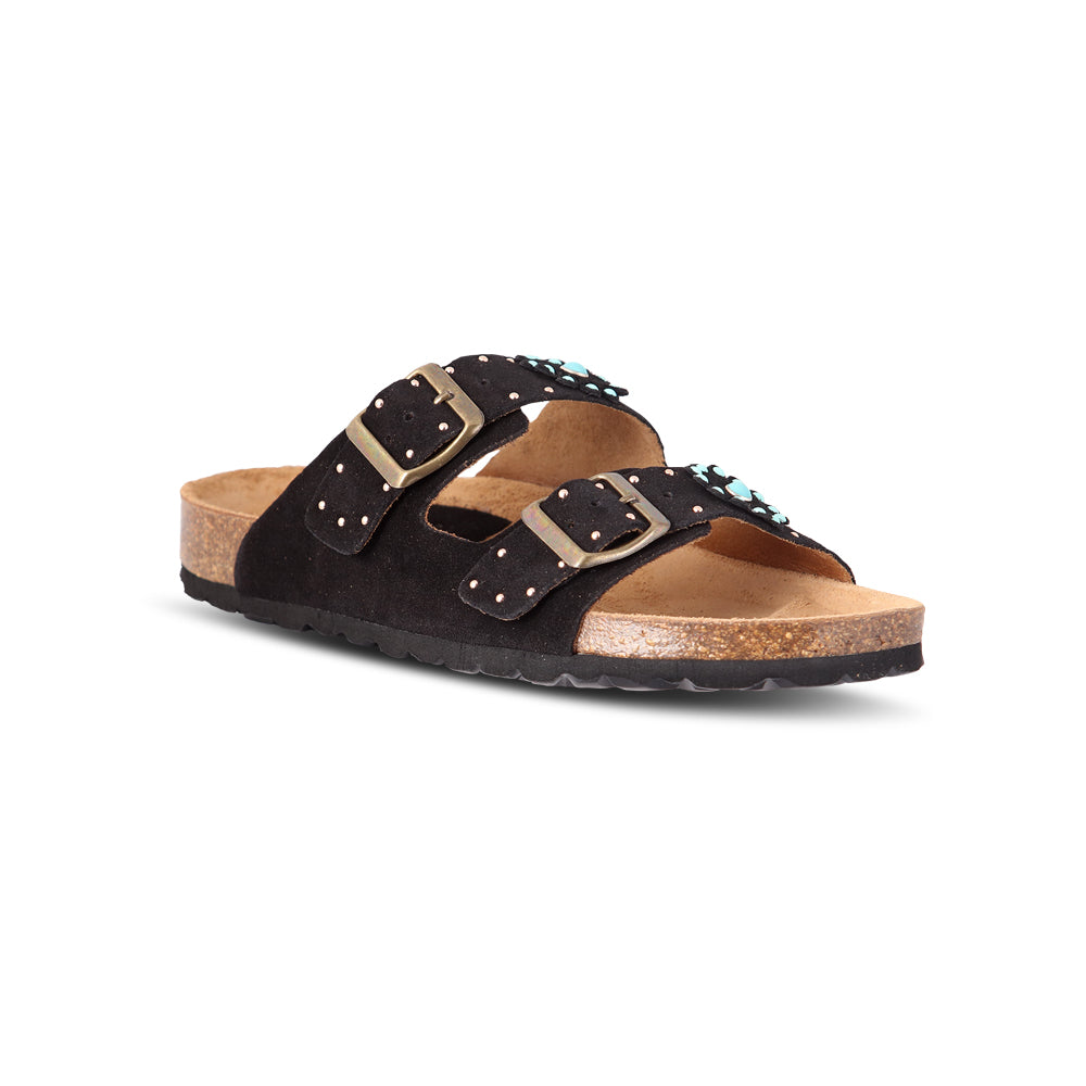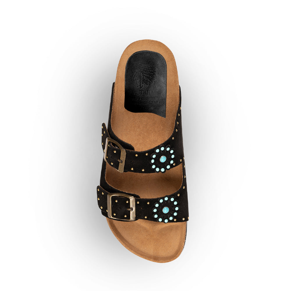 Sandal with two straps and buckles, anatomical sole lined with calfskin leather, upper and lining in setter-colored black calfskin, embellished with embroidery, studs, and turquoise stones.