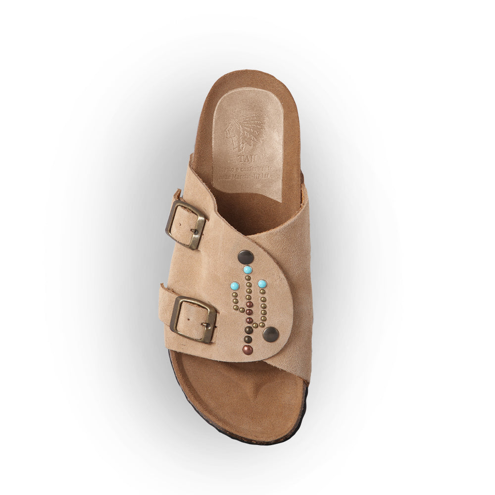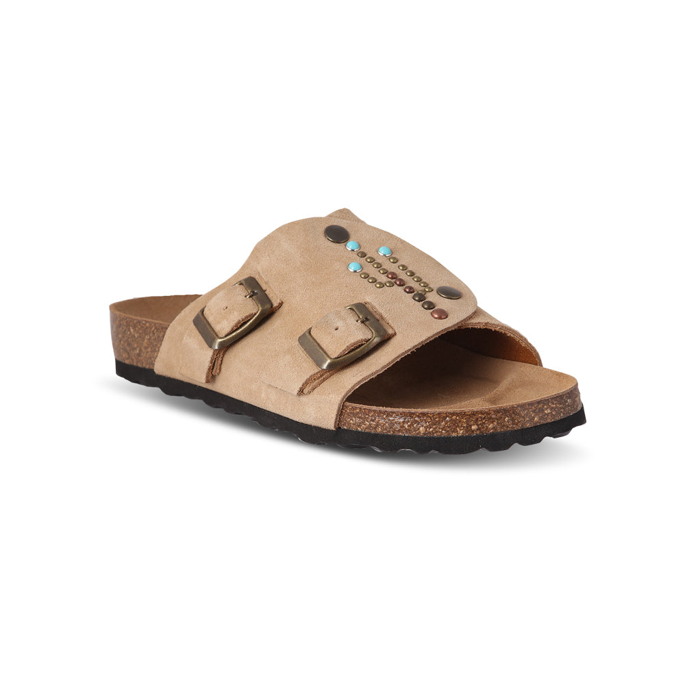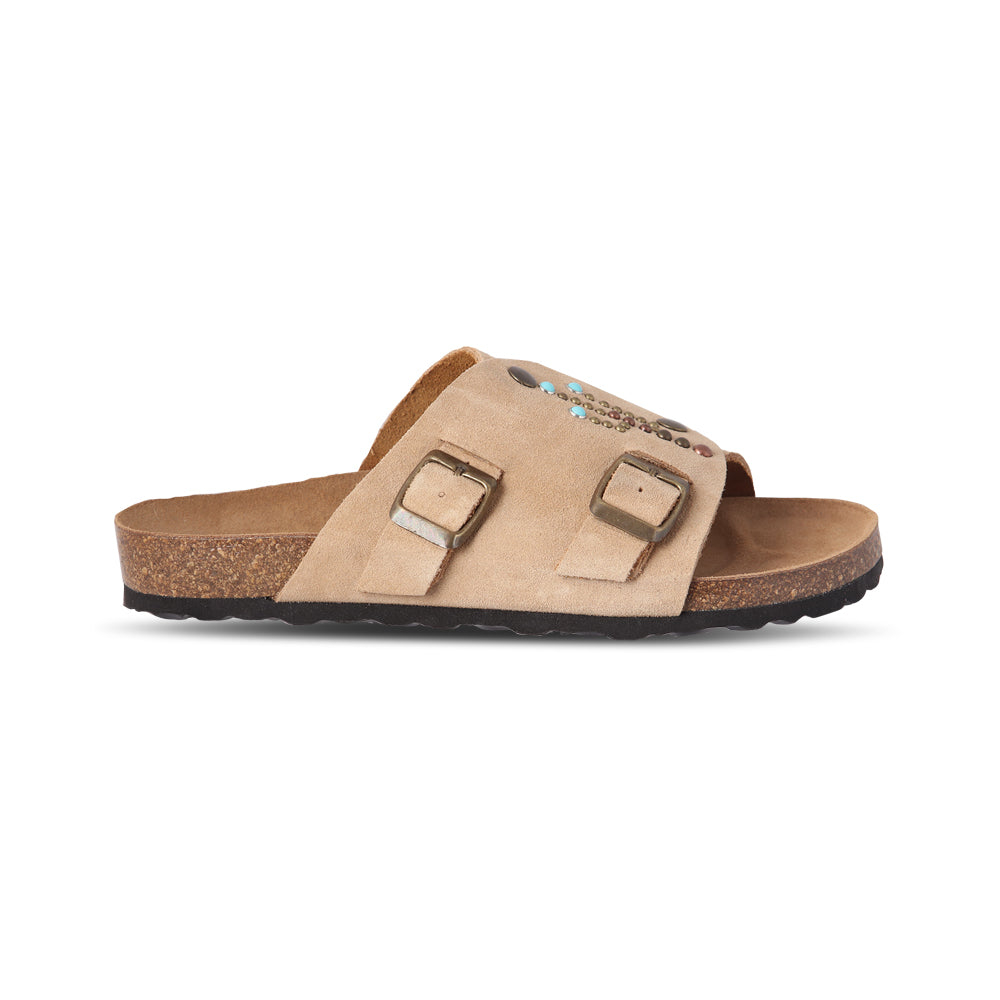 Step into the desert vibes with the Carry Cactus Sabots, a perfect blend of natural style and laid-back luxury. These sabots are beautifully crafted from high-quality suede, offering a soft and comfortable fit. The upper features a unique cactus-inspired design, embellished with a mix of turquoise, brown, and metallic beads that bring a touch of the wild outdoors to your footwear. The dual adjustable buckles ensure a secure and customized fit, making these sabots ideal for any casual or artistic ensemble.