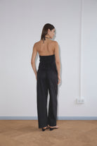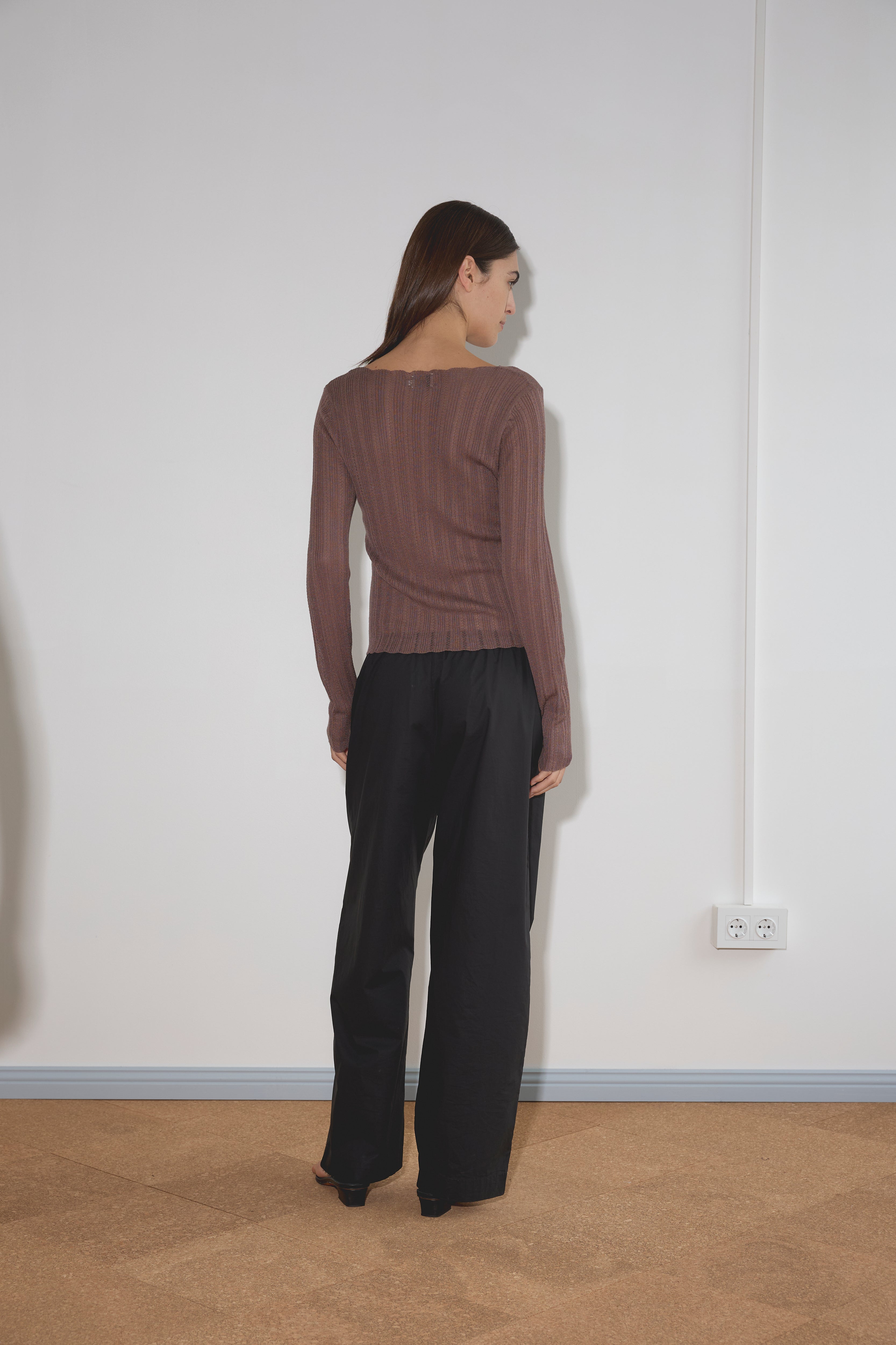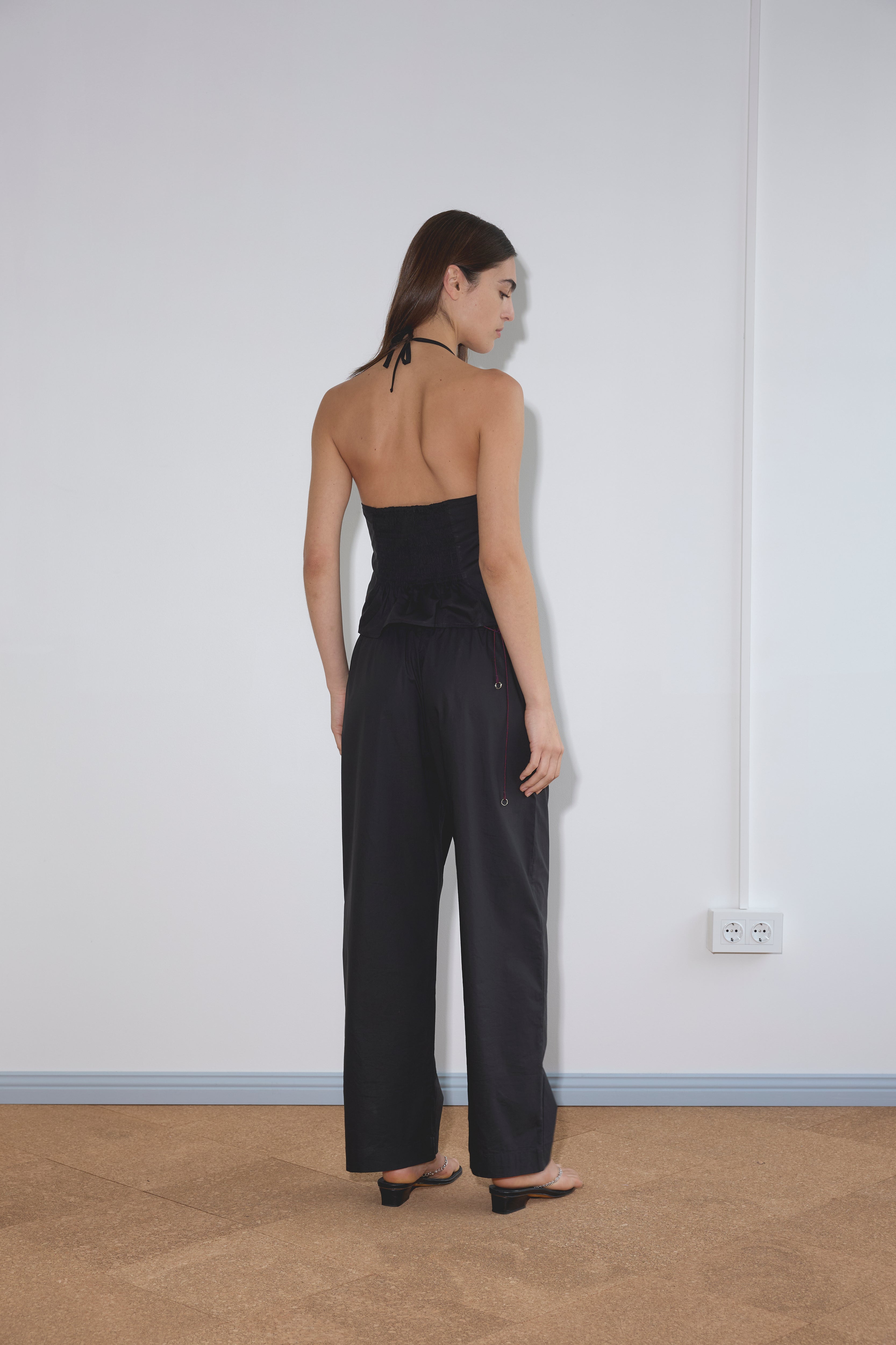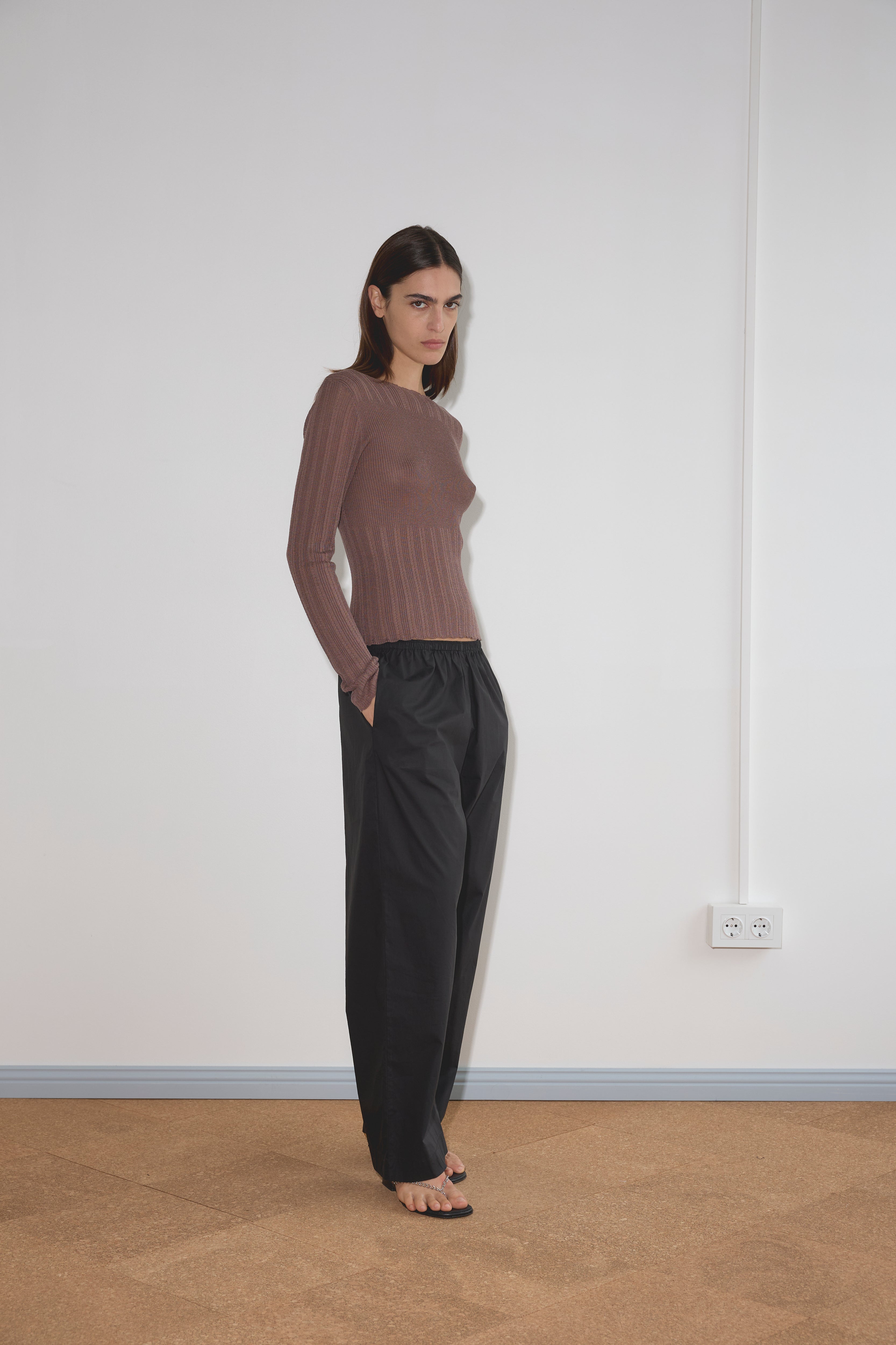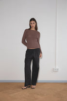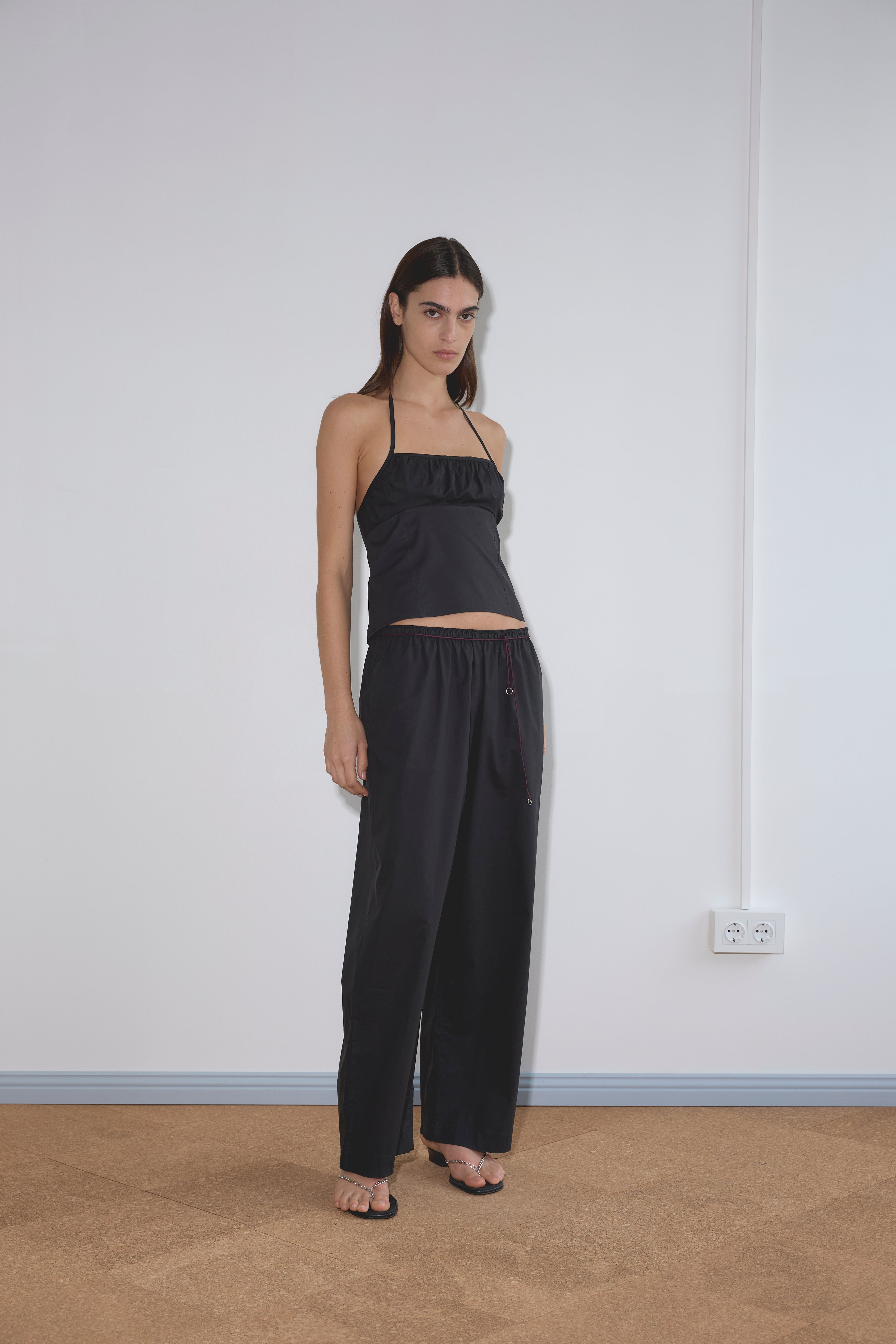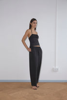 the ankle length pant features a soft minimal elastic waist with side seam pockets in a straight leg.