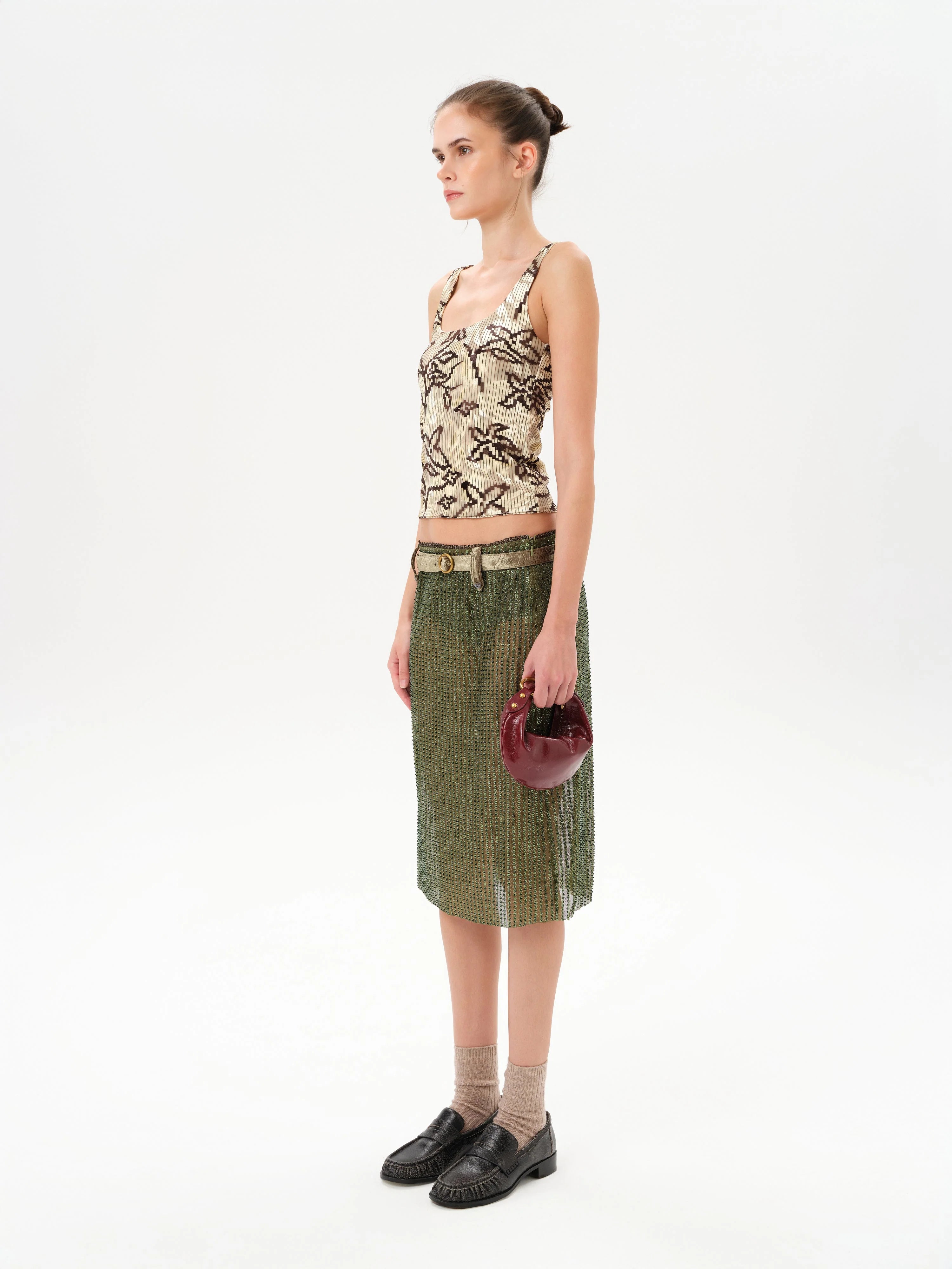 - Printed belt with gold hardware