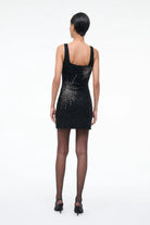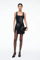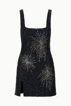 The classic beaded mini dress gets a festive firework pattern update for the season. This style offers slight stretch and has a hidden side zipper.
