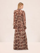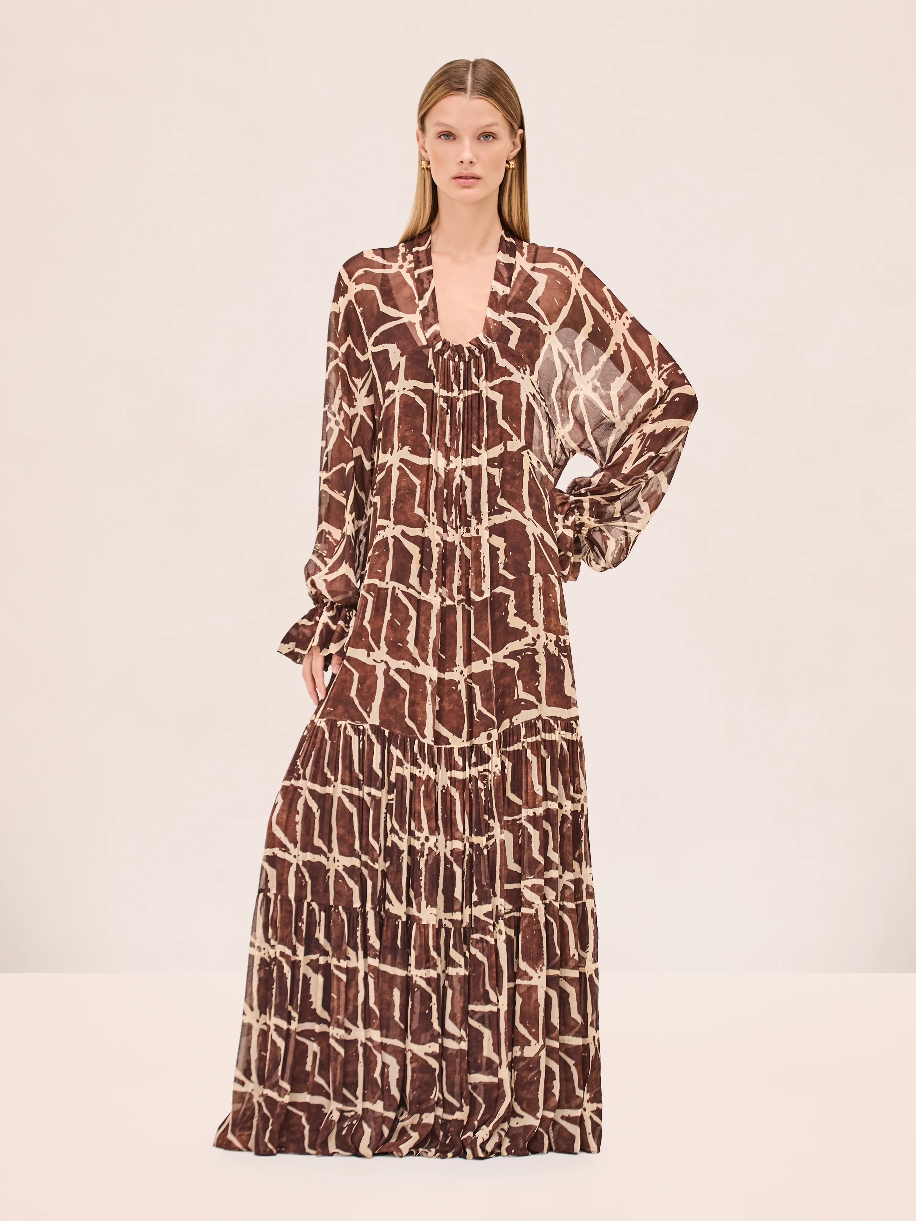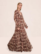 The Mykael Dress is a relaxed silhouette featuring a deep V neckline, tiered skirt, and abstract print.