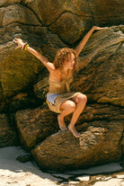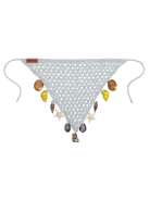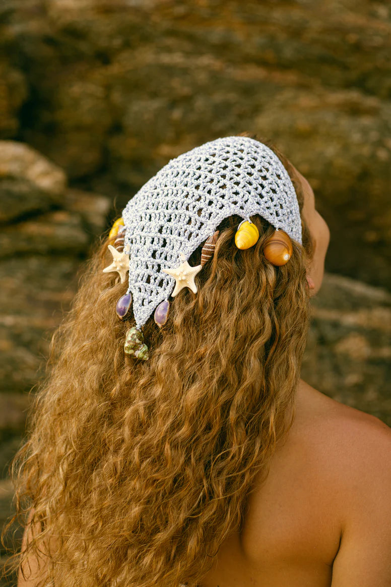 Silver colored crochet bandana with seashell adornments, that embodies coastal elegance. This versatile and stylish accessory is meticulously hand-crocheted with care and precision, featuring a soft and breathable fabric perfect for warm weather.