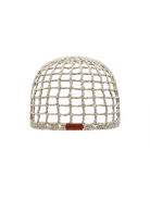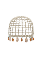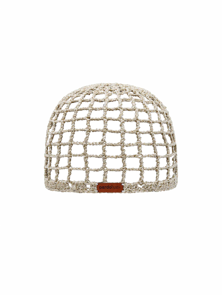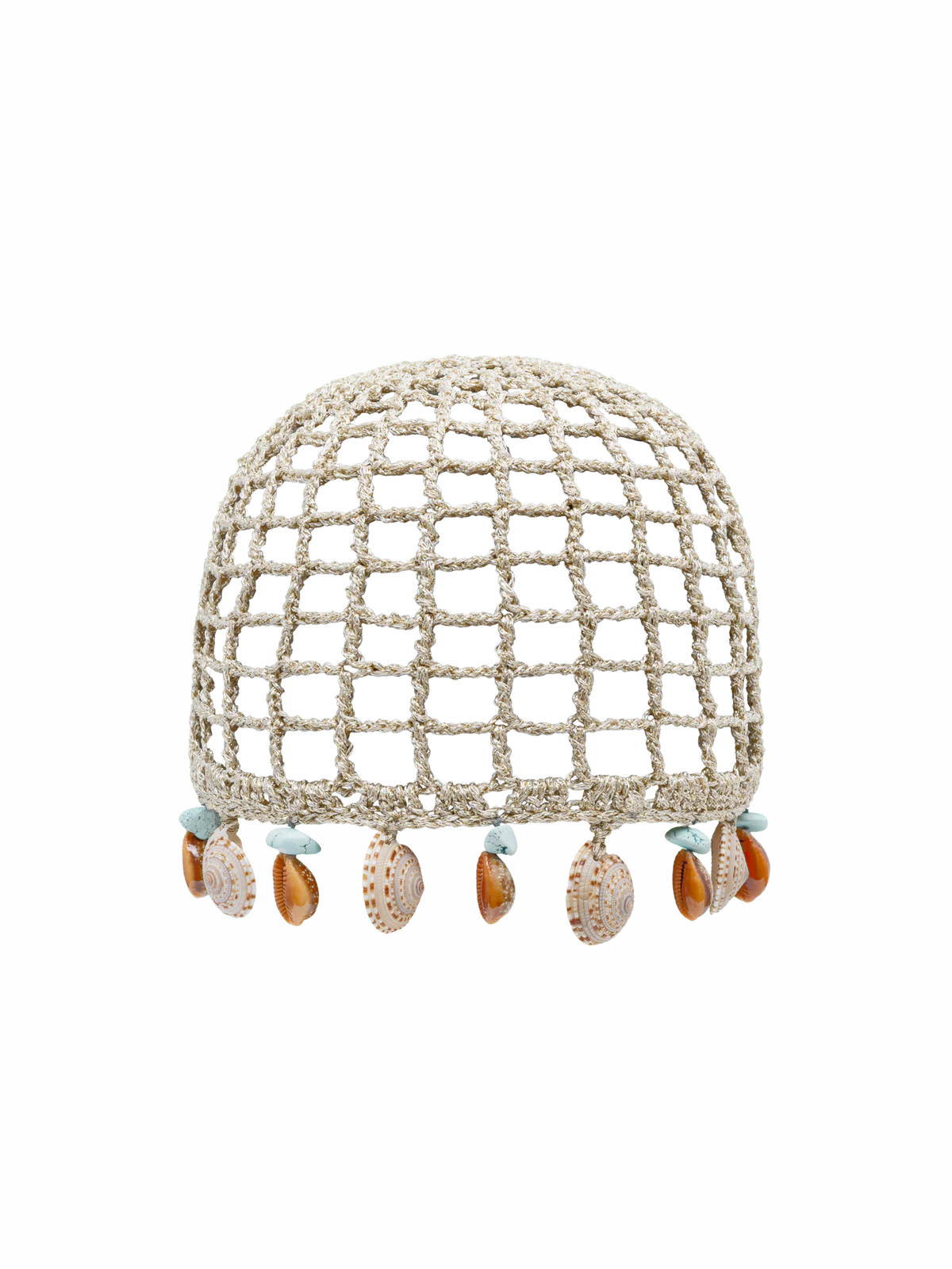 Shinny golden crochet skullcap with a geometric square pattern, adorned with a combination of seashells and stones.